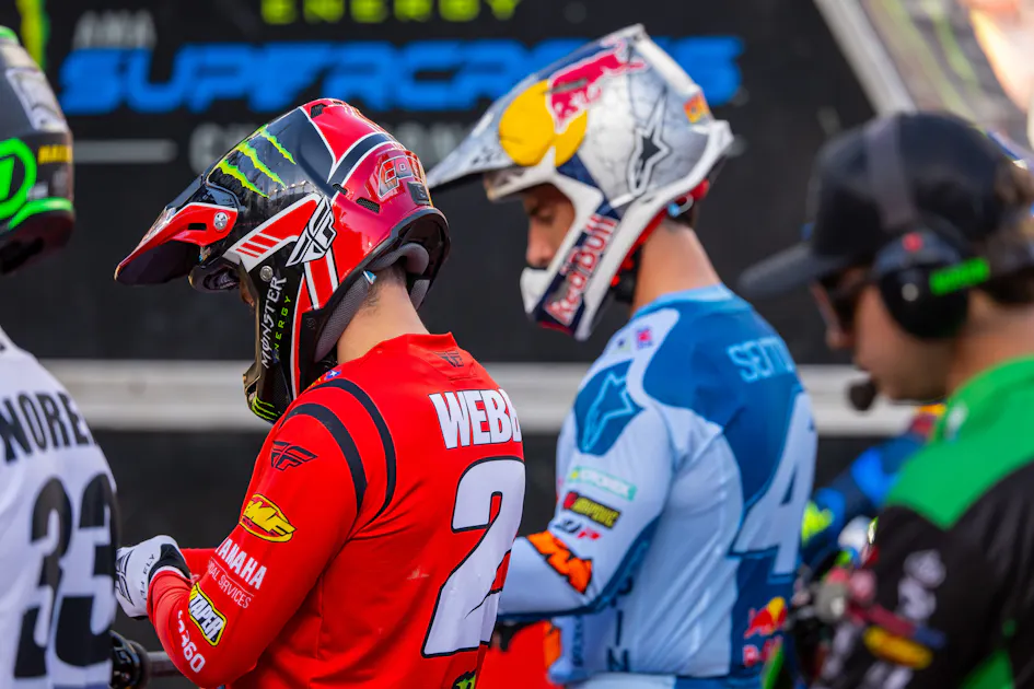 Sexton got stuck in the starting gate and then crashed on the first lap. Webb was up ahead in a big battle with Ken Roczen, which he ultimately won to take his first victory of the season. Sexton rallied back for a podium.