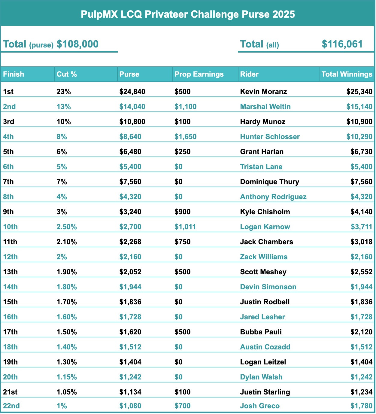 For the fourth year in a row, Feld let us run the Yamaha PulpMX LCQ Challenge race on Friday, and maybe, finally, we had some chaos. Thanks to you people buying the raffle tickets for the chance to win a 2025 Yamaha YZ450F and a bunch of other prizes, we’ve been able to give privateers almost 900K in seven years. The first three years of this, we handed out the money based on point standings. Then came the actual race, now in its fourth year. Kevin Moranz went 2-2 for the OA (we stagger start them for moto 2 with 22nd up front and 1st at the back), so for Moranz to go from 21st place to 2nd in 6 minutes, that was pretty good. He was helped by a rule change we at PulpMX made that allowed passing on the staggered start before you got to the first turn. Moranz moved his bike out of line (a little shady, but hey, PulpMX IS shady!) and got four guys right away before the first turn. Moranz won over 25K for his efforts, Marshall Weltin was second, and Hardy Munoz (the star of the show on the 250, if you ask me) got the third spot. And a good time was had by all, even Hunter Schlosser, who improbably endoed off the start of the staggered start.
