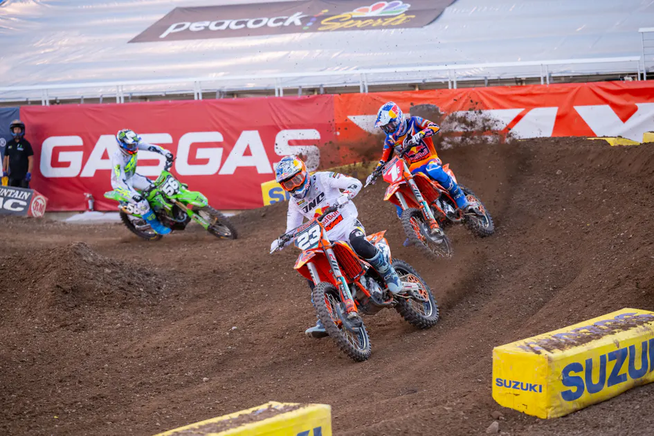The 250SX main event was all kinds of crazy. Let’s start with Julien Beumer. After passing Seth Hammaker and gapping him, he was suddenly back to within striking distance of Hammaker. When Hammaker passed him, Beaumer immediately threw a hard block pass on him in the next corner. Did it seem like Beaumer might have been doing what he could to try to help his teammate, Tom Vialle, or do we just need to remove our tinfoil hats?