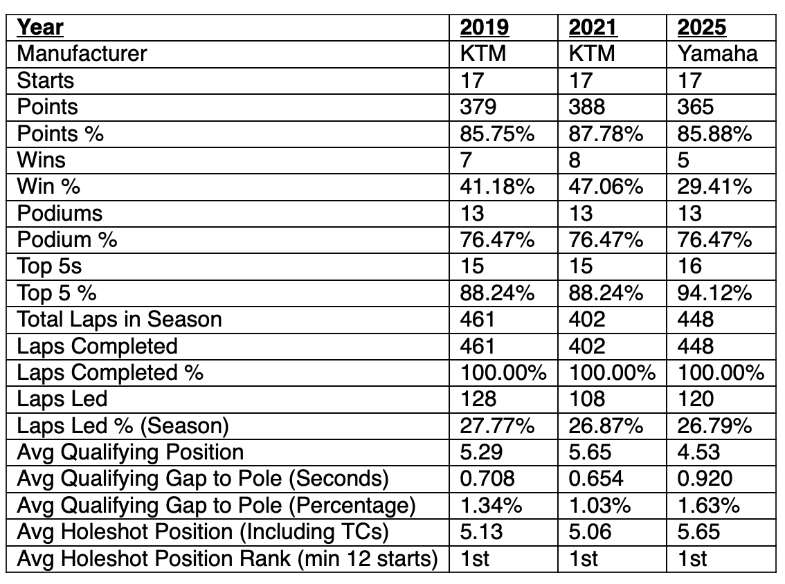 With this 2025 title, Webb also joined six other riders in SX history with three titles indoors, which broke him away from such icons as James Stewart and Chad Reed. We knew that, but how does this Cooper Webb compare to the “old” Cooper Webb when he won his titles on KTM?