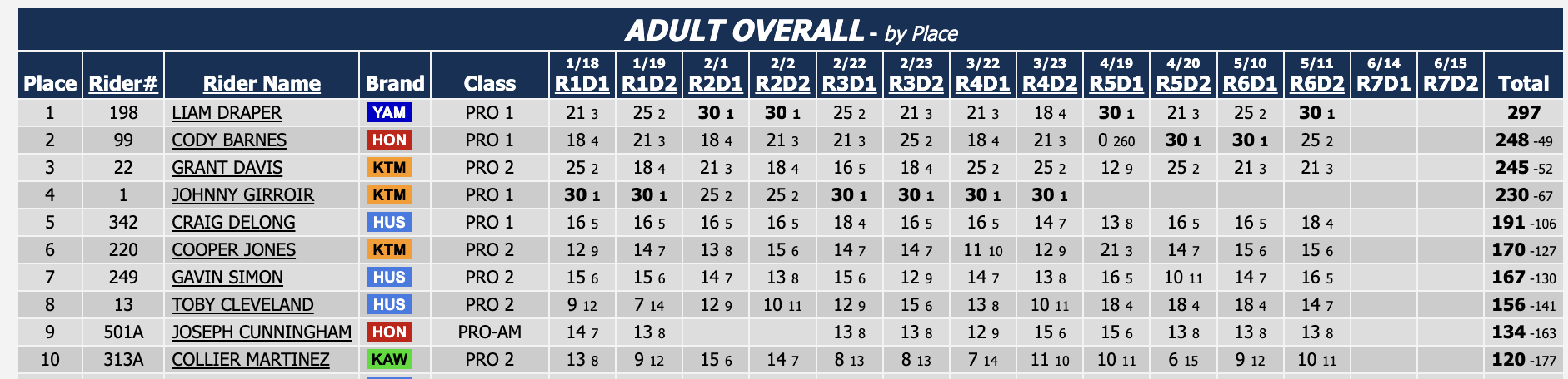 | 6 | Cooper Webb | Newport, NC | 516 | 112 |