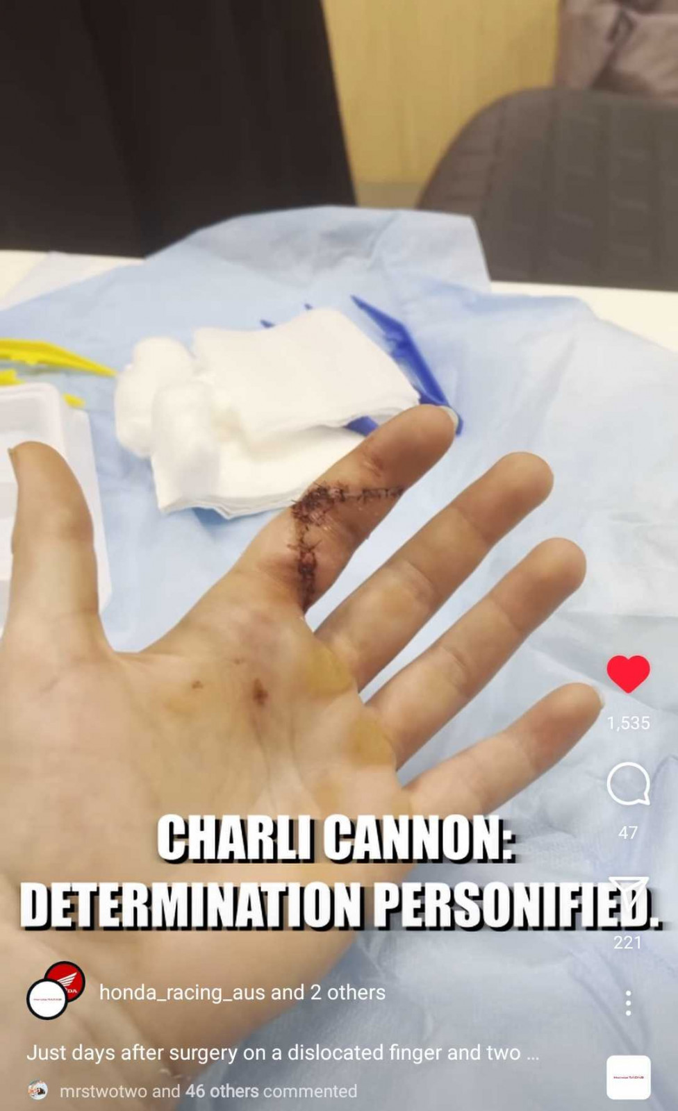 “Welp lol. P8 on the day. Hit a flashing medic light thing 2nd lap of second timed practice, broke my finger😵💫😵💫. Was a day of grinding lol. Onto the next. Thanks team 🫡”