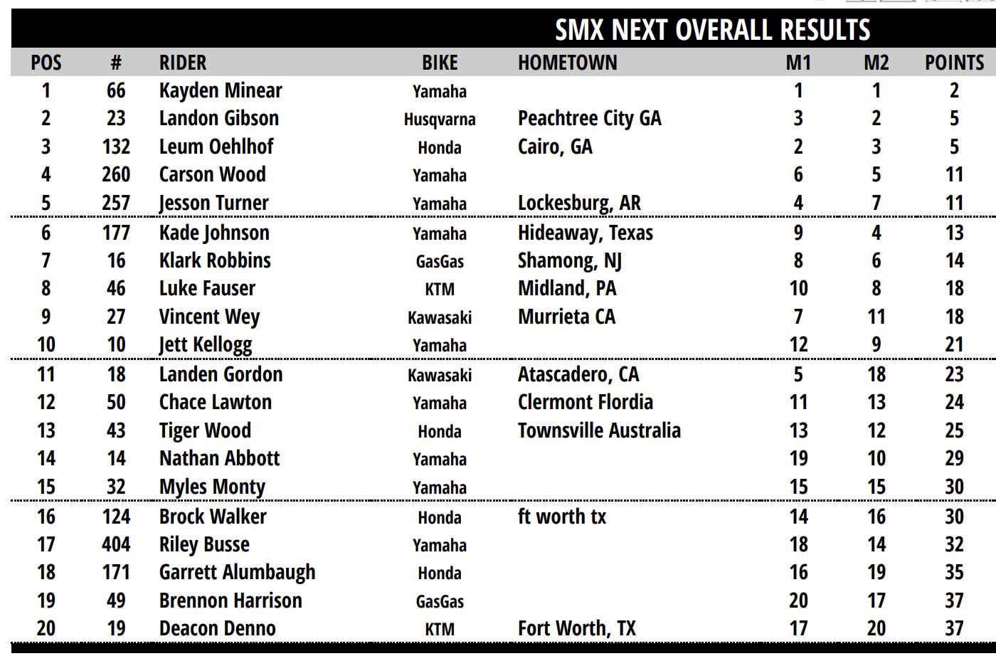 Minear’s 1-1 effort provided him with his first SMX Next triumph, while Gibson and Oehlhof finished tied for the runner-up spot, with the tiebreaker going to Gibson by virtue of his better Moto 2 result.