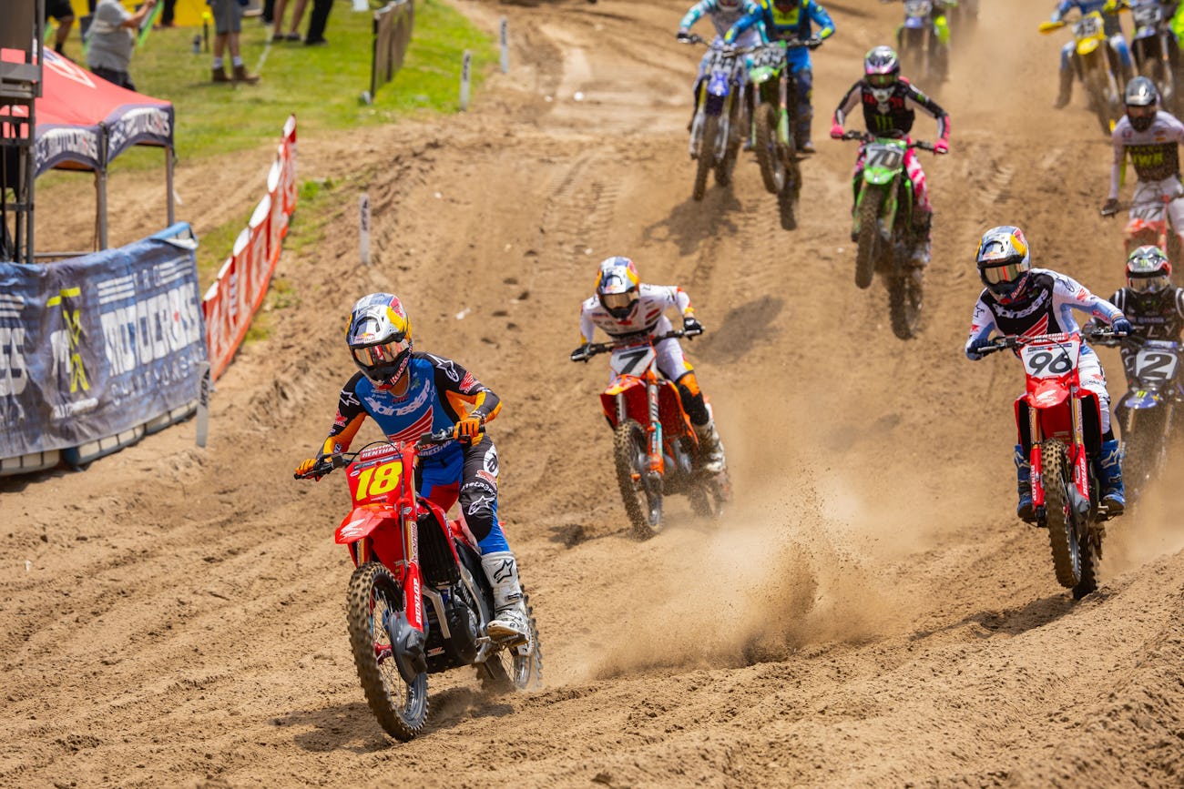 Hunter: Um, no, I wouldn't say he's been always getting me on the start, I think. Well, I know I whoop him during the week, and the starts, and I feel like the first few rounds, I was starting in front of him, actually. But it was just the first few laps is where he would, you know, get past me in the next corner or something like that. Obviously the first few rounds we were kind of working through some bike stuff and, and just not willing to go to that limit in the first few races, or send it in the first few laps. Honestly, we have to. It's an all-out sprint the first few laps and there's some stuff you have to do that you maybe don't want to do or take a certain line at a certain pace where you're like, “Hold on for dear life, hope this works out.” That takes a lot of confidence in the bike and stuff, and we're in a lot better position now. For me, I'm a guy that I need to get the time under my belt. I can't just click my fingers and go, “Oh yeah, I'm gonna do this and then wake up tomorrow and do it.” I have to log the laps, log the time and work at it.