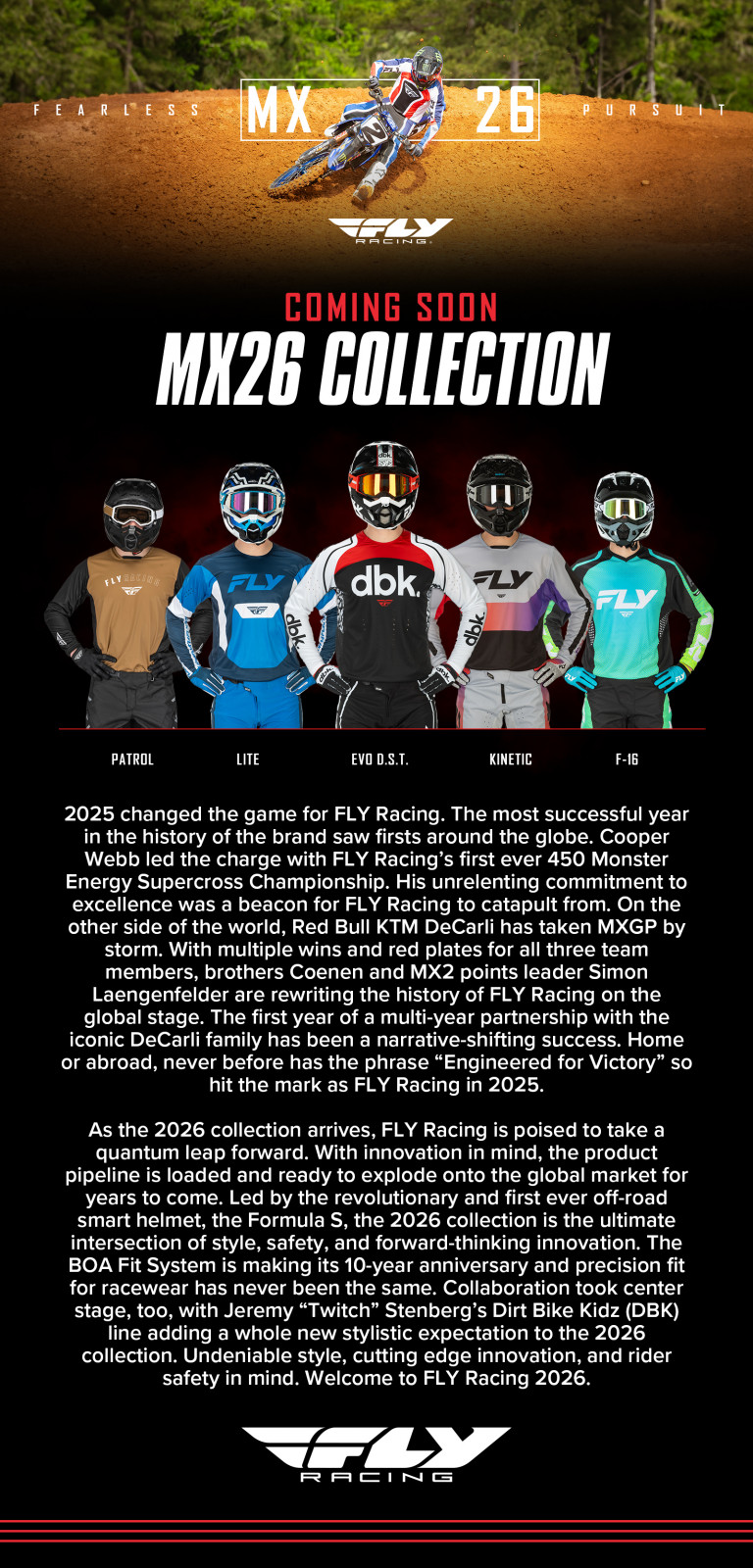 Undeniable style, cutting edge innovation, and rider safety in mind. Welcome to FLY Racing 2026.