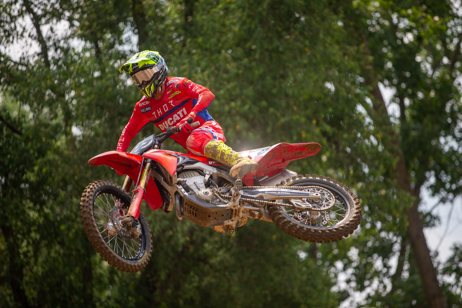 If you were following the mid-summer debut of the Ducati Desmo450 MX in the still-very-capable hands of nine-time FIM Motocross World Champion Antonio Cairoli, you already know that he’s not racing Washougal this week, as the team had only planned to do two rounds. Cairoli looked good on the bike, but he did have some bad luck with an electrical snafu early in the second moto at RedBud after a solid ninth in the first moto. Then, at Spring Creek, he crashed off the start in the first moto, and the bike ended up on top of him, the pipe burning his left butt cheek pretty good. Fortunately for Cairoli, a fan of his, #35 Marshal Weltin, was right there to help. In a very cool sportsmanship move, Weltin stopped his own race, dropped his bike, and helped Tony out, later telling Weege in the Best Post-Race Show Ever that Cairoli is his all-time favorite rider. Marshal could have added “and one of the all-time toughest too,” as Cairoli got himself sorted and jumped back into the race, despite his exposed burn and all of that sand grinding on it. Cairoli went from dead last to 23rd, passing 17 riders and tying him with the French 250 rider Scotty Verhaege for the Hard Charger Award on the day. In the second moto, Cairoli finished tenth.