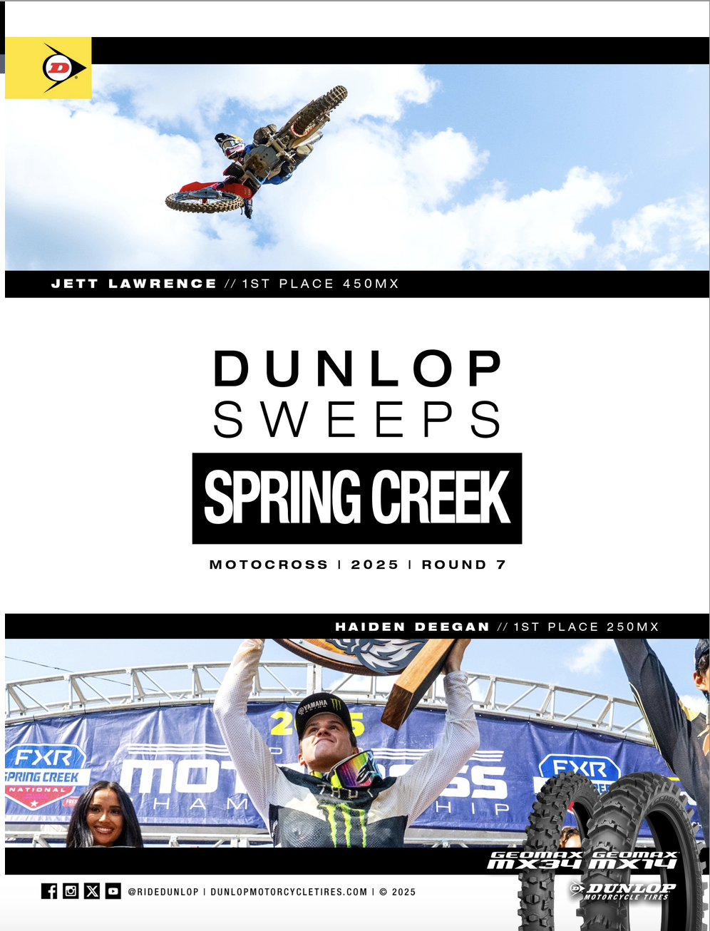 To the winners go the spoils, and in this case, the whole Spring Creek National was a big winner. The track was epic, the place packed with fans, everyone got to see Jeremy Martin go out like a lion, and they also saw another set of overall wins for series points leaders Haiden Deegan and the still-unbeaten (in overalls anyway) Jett Lawrence, though Jett did lose a moto to big brother Hunter. Some of the main backers of the riders mentioned above went to Cycle News with a fresh batch of wins ads from Yoshimura (for Jett), Yamaha (for Haiden), and Dunlop (for both). Additionally, there were a couple of farewell send-off ads for J-Mart, who really stole the show at his home race. Well done, FMF and Yamaha.