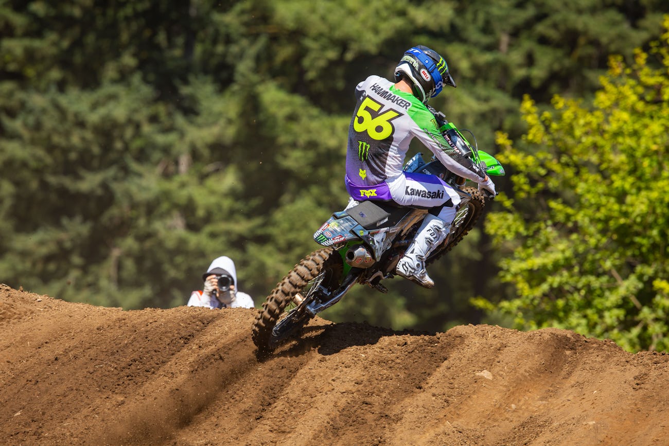 At the Washougal National, Hammaker had one of his best rides in the AMA Pro Motocross Championship to date. He rode home a seventh in the first moto then got a great jump and was out front off the gate drop in the second moto, running a solo second for a majority of the race. Eventually, he was caught and passed late by championship leader Haiden Deegan, but the #56 came through in third place. And this came while riding through a banged-up body, as he deals with shoulder and knee injuries.