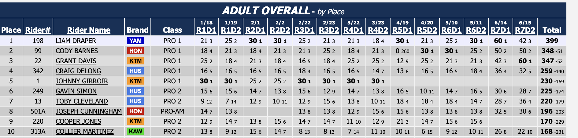 | 6 | Cooper Webb | Newport, NC | 516 | 112 |