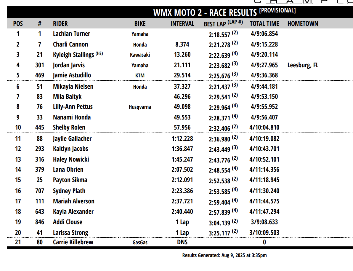 August 9, 2025| Rider | Time | Interval | Best Lap | Hometown | Bike | |