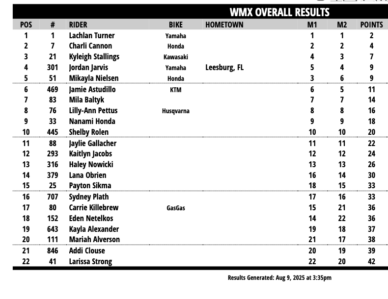 The red flag called for a full gated restart. In order to keep the racing on schedule, the moto was shortened. Once again, Stallings got an extraordinary jump out of the gate and had the early lead. But by the time the field came out of the woods and up and down Godzilla hill, Lachlan Turner and Charli Cannon had both made moves past the #21 machine. Mikayla Nielsen also made a move on Stallings, this one for third. But late in the race, Nielsen had a crash at the top section of the track that dropped her a few positions. Stallings got back into third. Turner took the race win, going 1-1 for the overall win. Cannon landed 2-2 for second overall as Stallings rounded out the overall podium with 4-3 moto finishes. Jordan Jarvis was fourth overall with 5-4 finishes, then Nielsen rounded out the top five with 3-6 finishes.