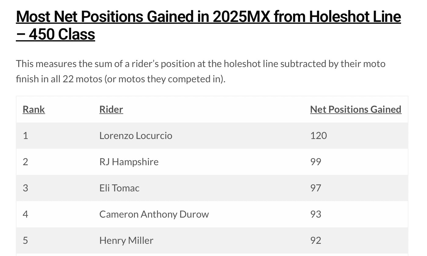 Finishing up the season in fifth overall, Hampshire found consistency without the help of great starts. As PulpMX's Super Stats pointed out, RJ passed the second most riders all summer in the 450 class. Quite the feat in such a deep field of talent.