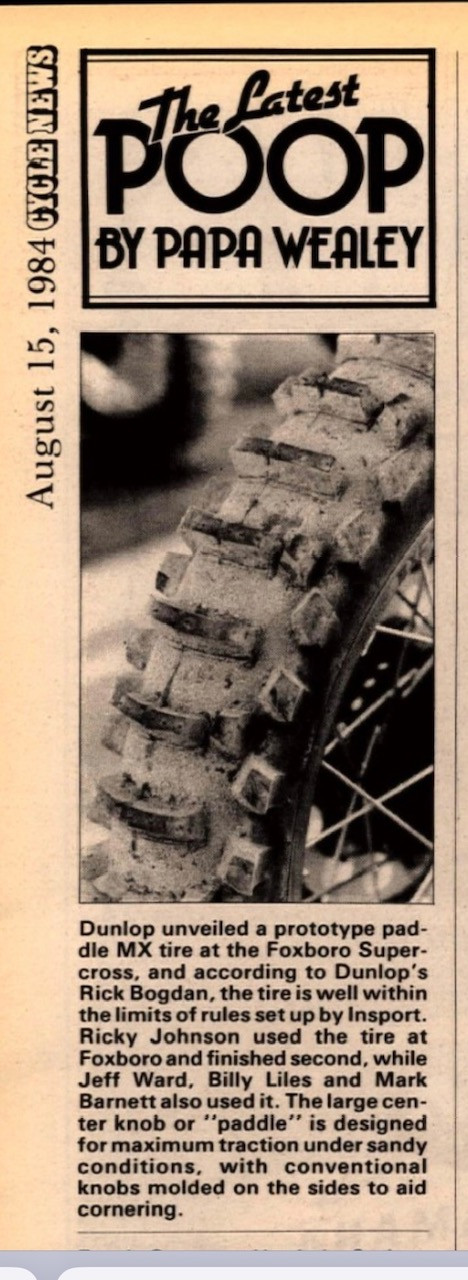PulpMX listener Jason sent me this photo and caption from an old CN. Interested in this whole scoop tire thing? Well, it seems like 1986 was the debut of Dunlop coming out with it!