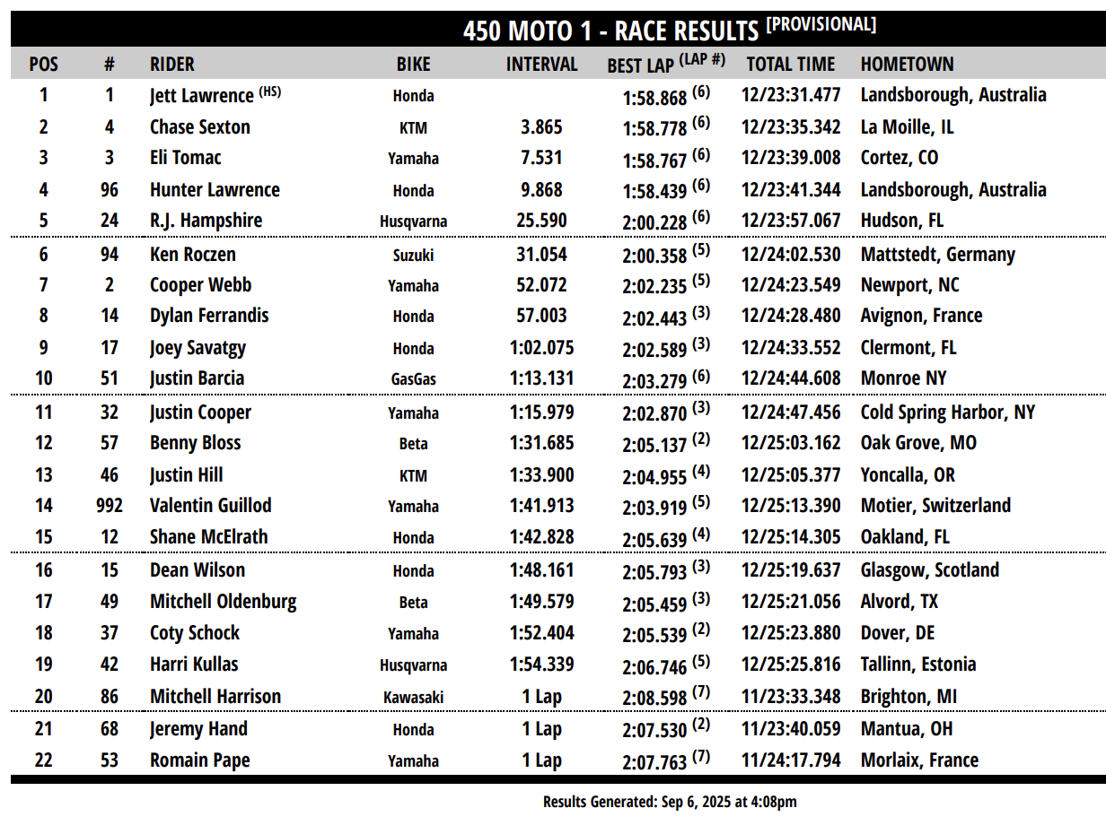 Concord, N.C. — Team Honda HRC Progressive's Jett Lawrence kicked off the postseason with a victory at Playoff 1 of the 2025 SMX World Championship™. The two-moto format of the postseason was interrupted by lightening near the zMAX Dragway at Charlotte Motor Speedway. Both classes scored their overall results based solely on their first moto finishes due to the second motos being called because of continued lightening in the area and diminishing daylight. Jett Lawrence, the defending two-time SMX World Champion and recently-crowned 2025 AMA Pro Motocross Champion, led from start to finish in the single 20-mintue plus one lap 450SMX Class moto.