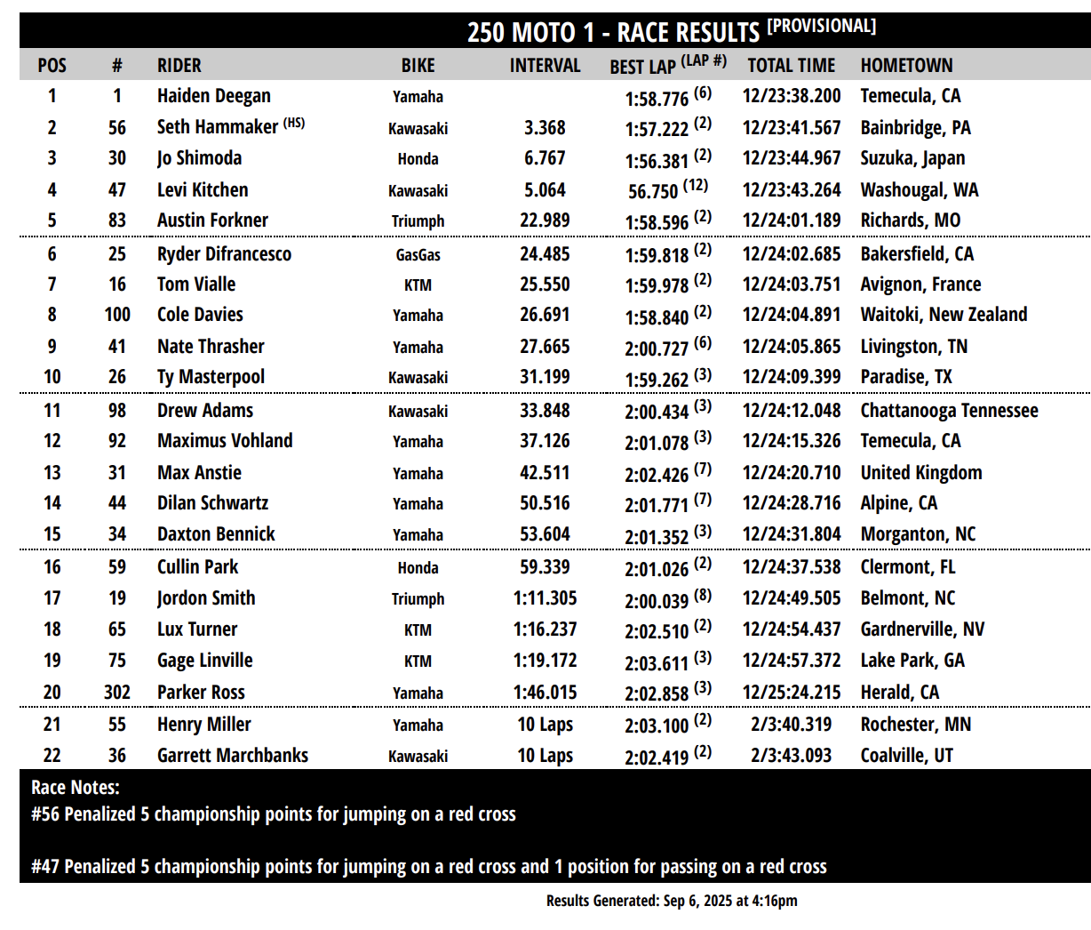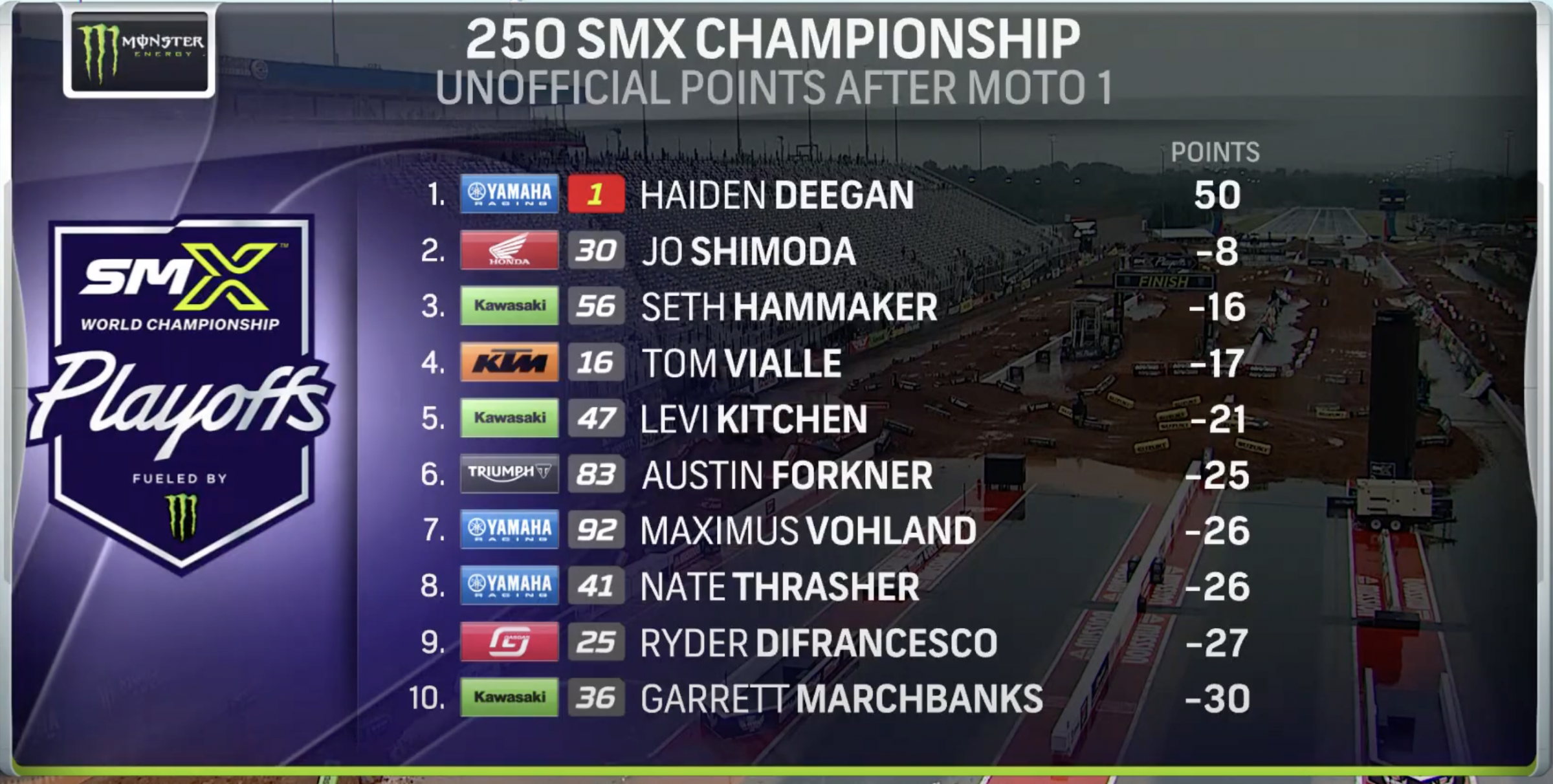 In 250SMX Class racing, two-time SMX World Champion in the class Haiden Deegan recovered from a poor start to start the post-season with a dominating win. Monster Energy Pro Circuit Kawasaki's Seth Hammaker nabbed the holeshot and pulled a huge gap on the field. Hammaker gave up the top spot with two laps remaining but held off Monster Energy Pro Circuit Kawasaki's Levi Kitchen at the end. Due to a cross-flag penalty, Kitchen was docked one position and was awarded fourth place in the moto. Team Honda HRC Progressive's Jo Shimoda, who crashed early during a pass attempt for the lead, recovered brilliantly from outside the top ten to take the final podium spot.