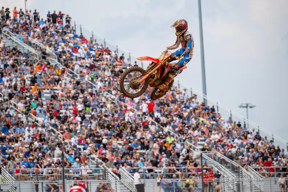 There is really not much Jo Shimoda CAN'T do....as he sends it early for the lead chasing Seth Hammaker: crashes, gets buried under a tough block and still manages to put it on the box in the first moto at round 1 of the Supermotocross Playoffs.