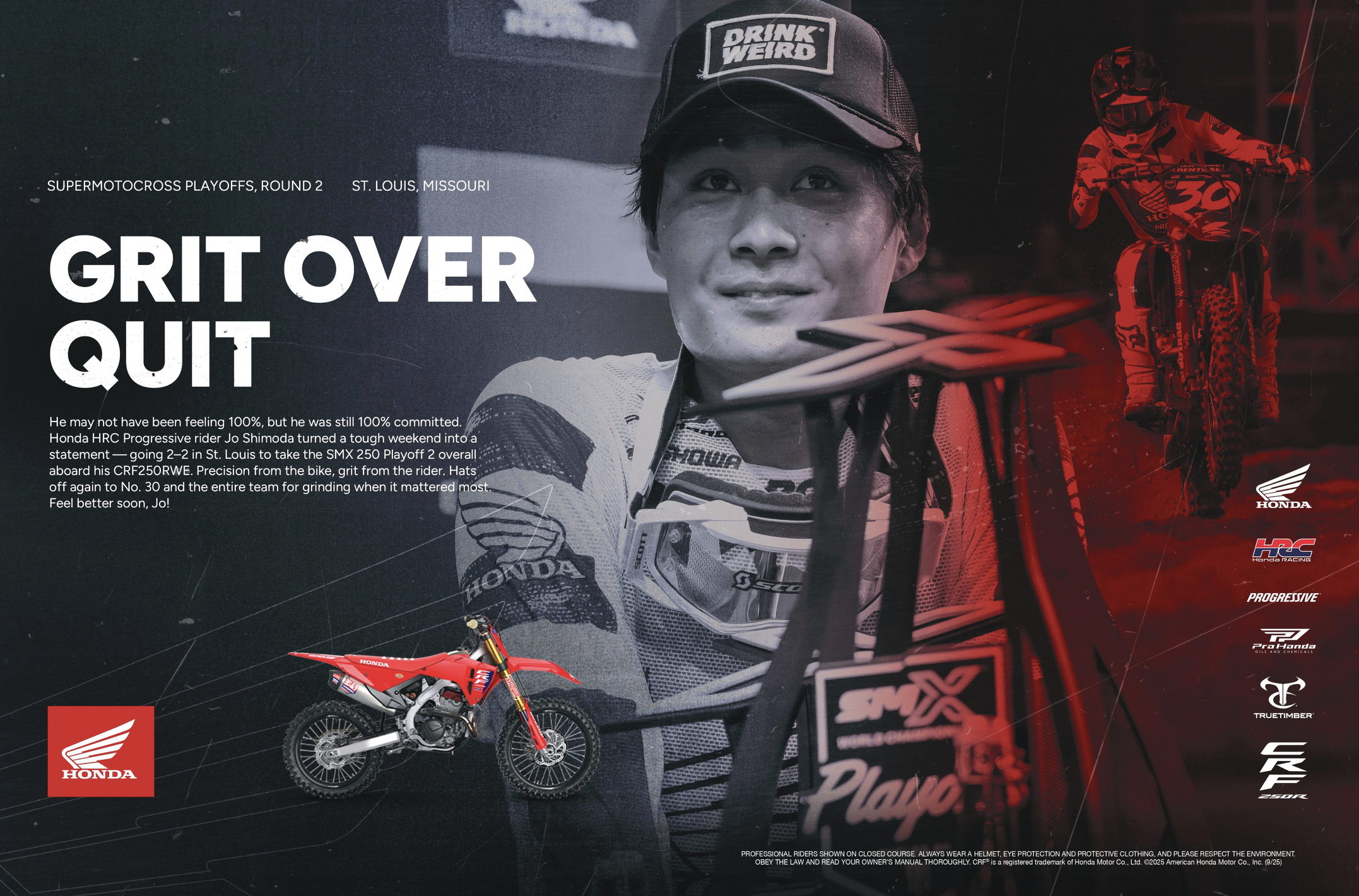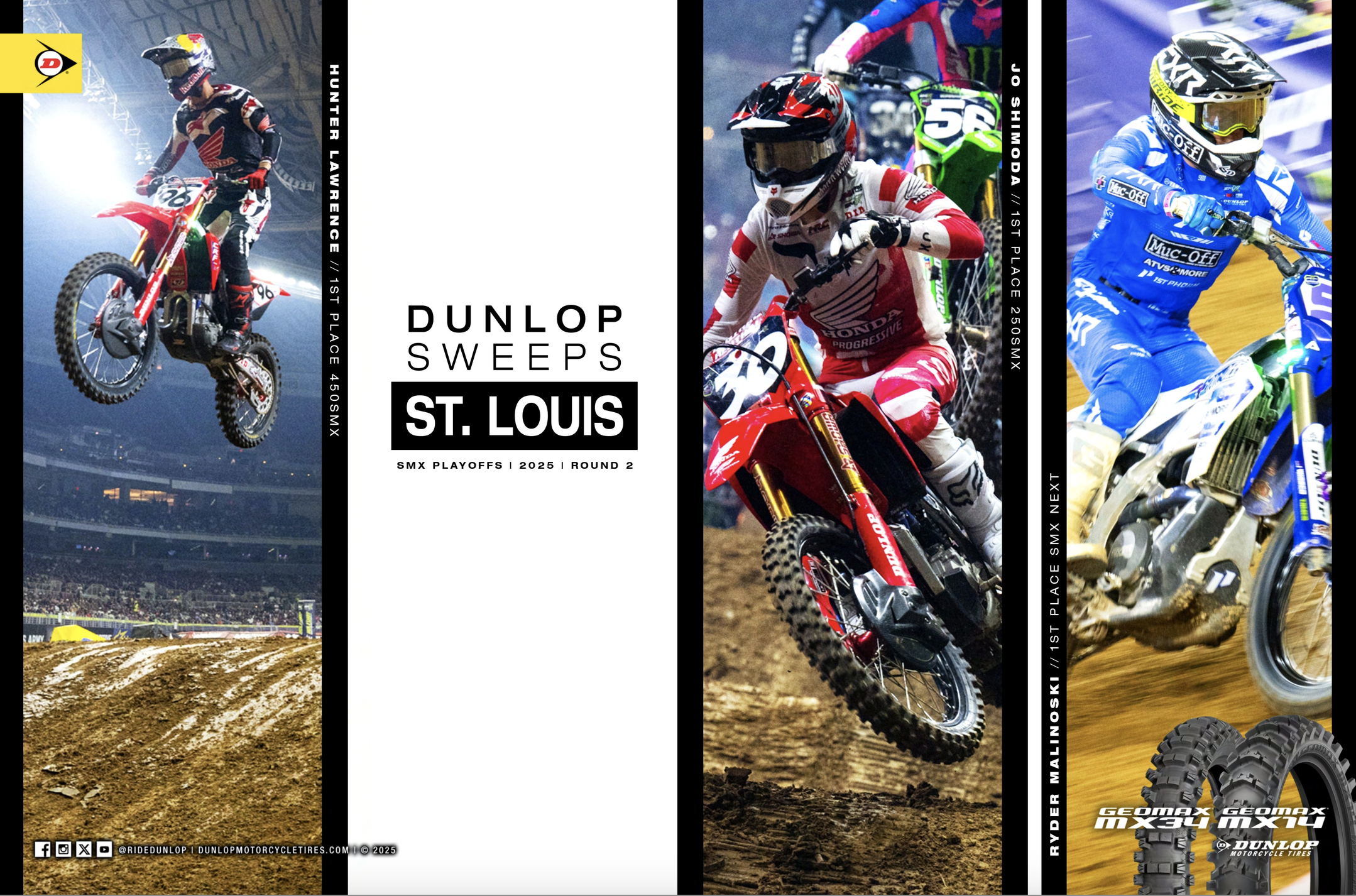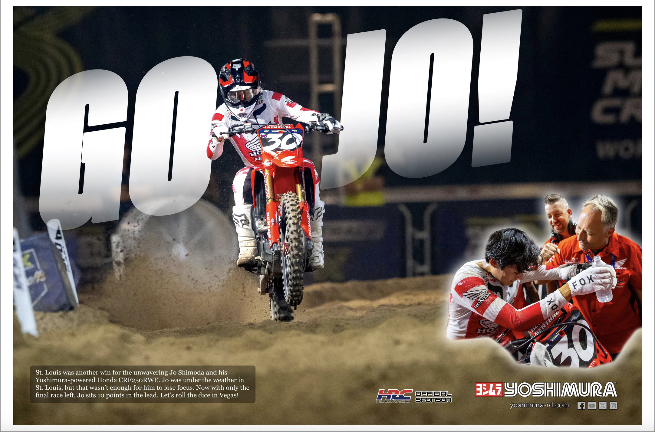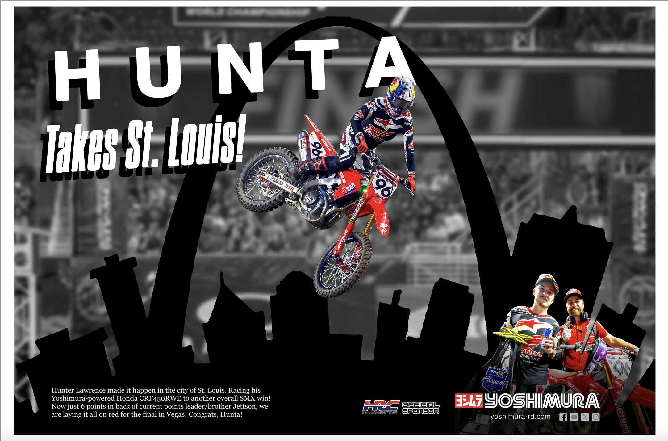 A great weekend for Hunter Lawrence and Jo Shimoda at the St. Louis SMX meant a great week for Honda, Yoshimura, Dunlop, and more to celebrate in Cycle News. Hunter's win puts him in a nice spot to challenge his little brother Jett for the $1 million bonus tomorrow in Las Vegas. It also gave the advertising managers a chance to do something for Hunta rather than Jett. And Shimoda's win, despite his illness, also made for a nice headline from Yoshimura: "Grit Over Quit." While Hunter and Jo each got their own ads from Honda and Yosh, they were together on Dunlop's win ad, joined by an unlikely third man in young Ryder Malinoski, who won the SMX Next World All-Stars main event on Saturday for the Muc-Off/FXR/ClubMX Yamaha team, though the title went to Kayden Minear. (I was watching Malinoski after I saw Daniel Blair's video predicting a win, and he was spot-on.) Hunter also got a pat on the back from Alpinestars with a goggle ad. And then there was a win ad for Beta's Dare DeMartile, who won his fourth straight WORCS race at Glen Helen Raceway.