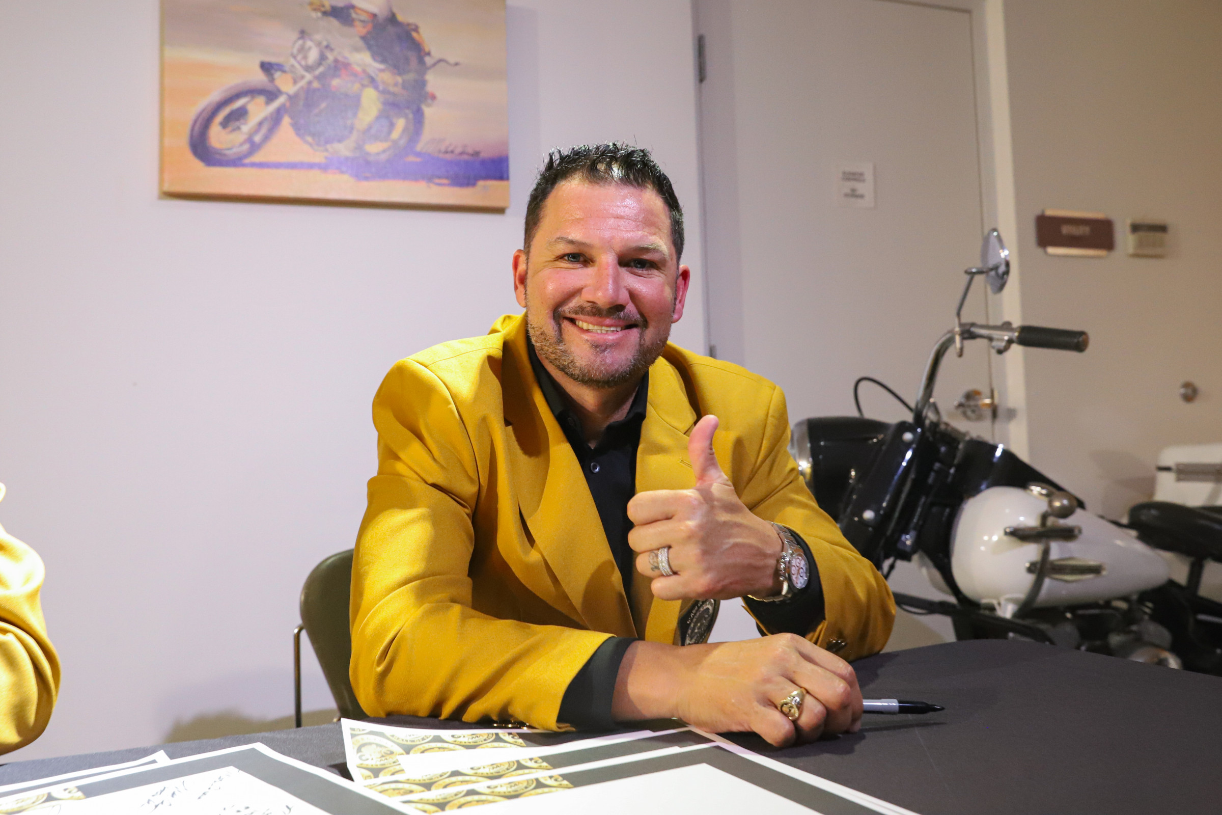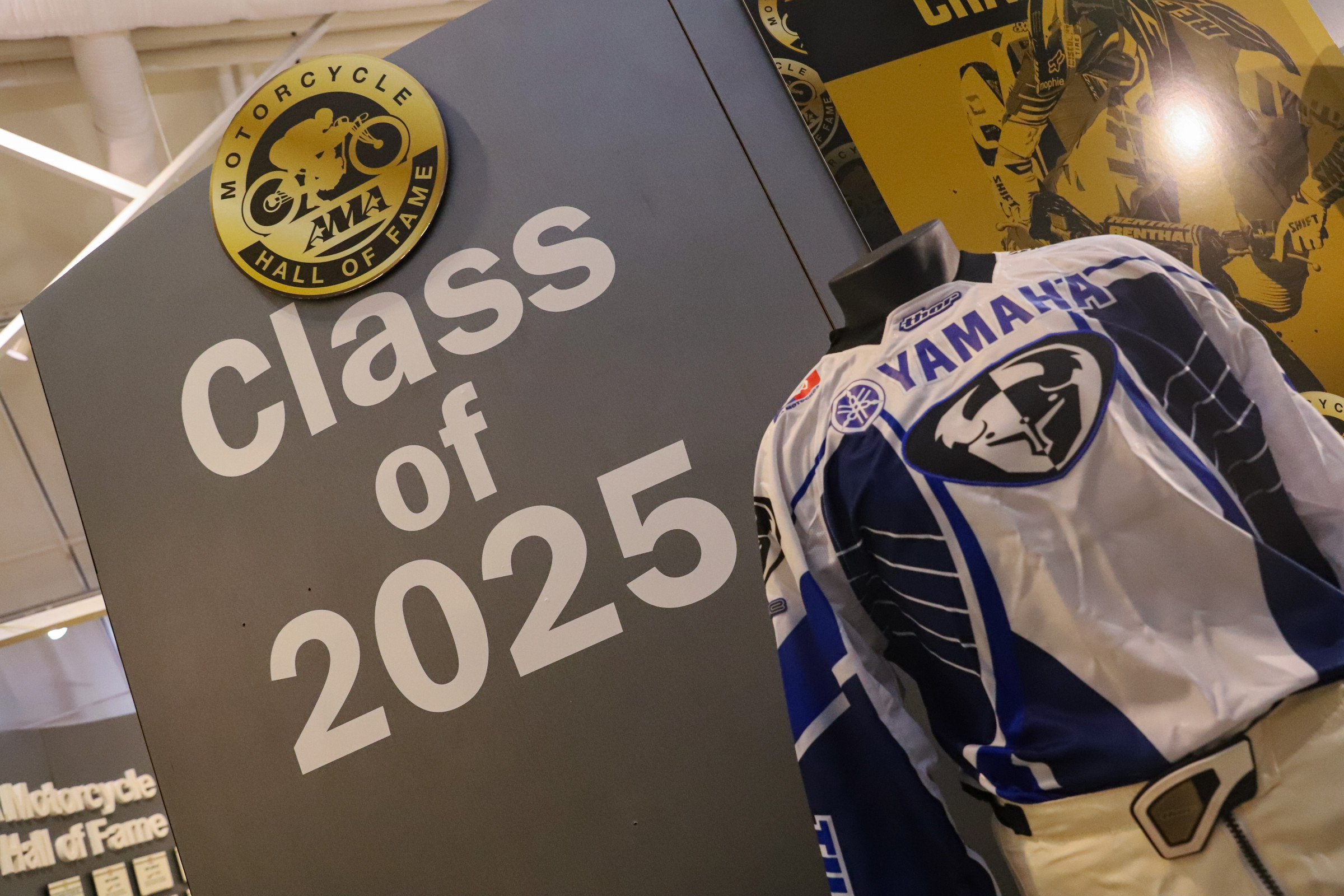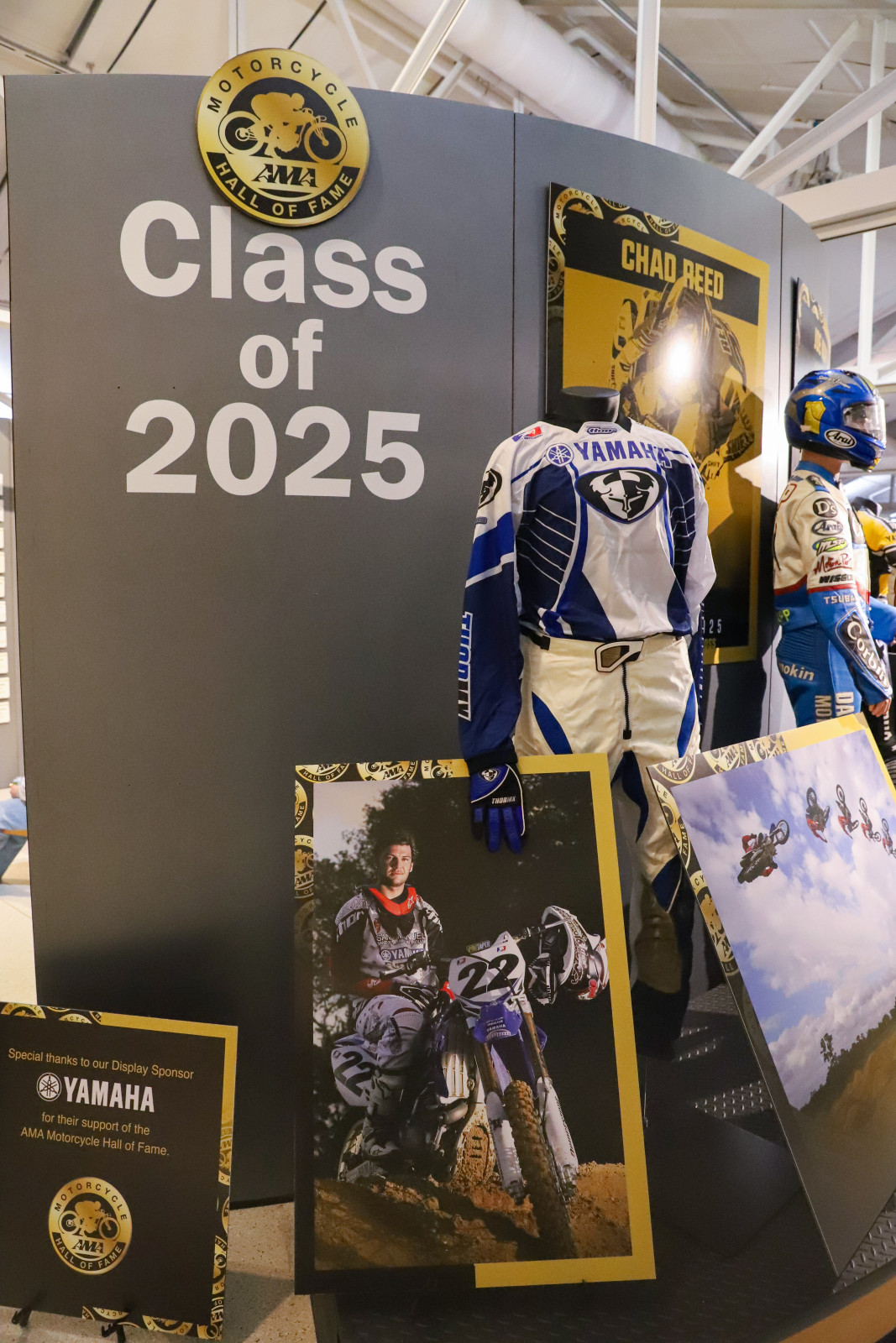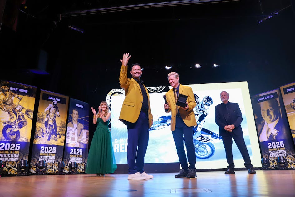 Welcome to Racerhead, coming to you from the Holiday Inn Express that's not far from the AMA Motorcycle Hall of Fame. Last night we witnessed Chad Reed and five other deserving motorcyclists—World Superbike Champion Colin Edwards, trials legend Ryan Young, flat-tracker Joe Kopp, businessman Chris Carter, and rider/land-use protector Dana Bell—all be inducted into the AMA Motorcycle Hall of Fame. Each were presented a gold jacket, courtesy of the Broc Glover family, a Hall of Fame ring, and then an opportunity to talk about their lives and careers in a theater full of fellow Motorcycle Hall of Famers. It was a very well-done ceremony hosted by actor/rider Perry King and Laurette Nicoll.