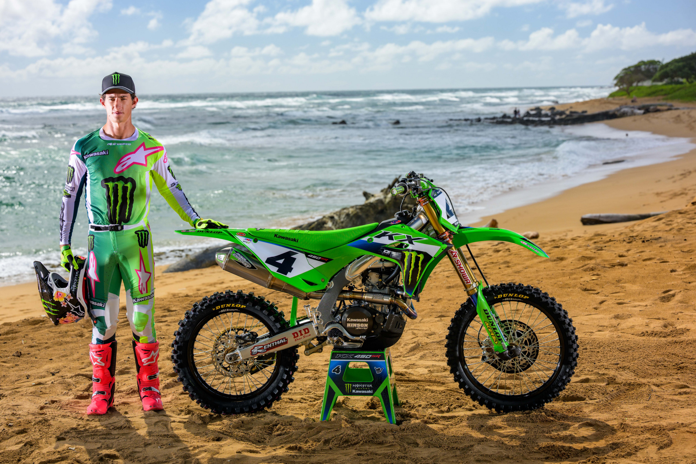 “I want to be here at Kawasaki for a while,” he says. “It’s kind of a different mindset for me. I just kind of want to find a home and work around really good people and I feel like I’ve found that. It’s still early, obviously. It’s still the honeymoon stage, but I think for me, it’s off to a really good start. It’s been fun so far. We’ll see at Anaheim. The team is really cool. They’ve been around for a while. They have a lot of knowledge and that’s something I kind of lean on and trust in. I have Theo Lockwood as my crew chief and then Rango (Jason Motoya) as my mechanic. They came to Hawaii with the bike and stuff for the team photo shoot, so I got to spend some time with them there away from the track. They’re really good people and trustworthy, so I’m really excited. It’s a good change. I think everyone loves change. You see the same guys on the same bikes for so long. I think everyone likes the KTM I raced, but for the most part, it seems like everyone wants to see me get back on a Japanese bike. That’s kind of the same for me. Everyone is stoked on it and how it all looks. For the little part of time that I’ve ridden on the bike, I feel looser on the bike and just kind of open. I feel loose and I can move around more on the bike, which for me allows me to go faster. That’s something that I didn’t really ever find at KTM. I felt like I was pretty stiff on it. I kind of want to get a little more open and more loose on the bike.