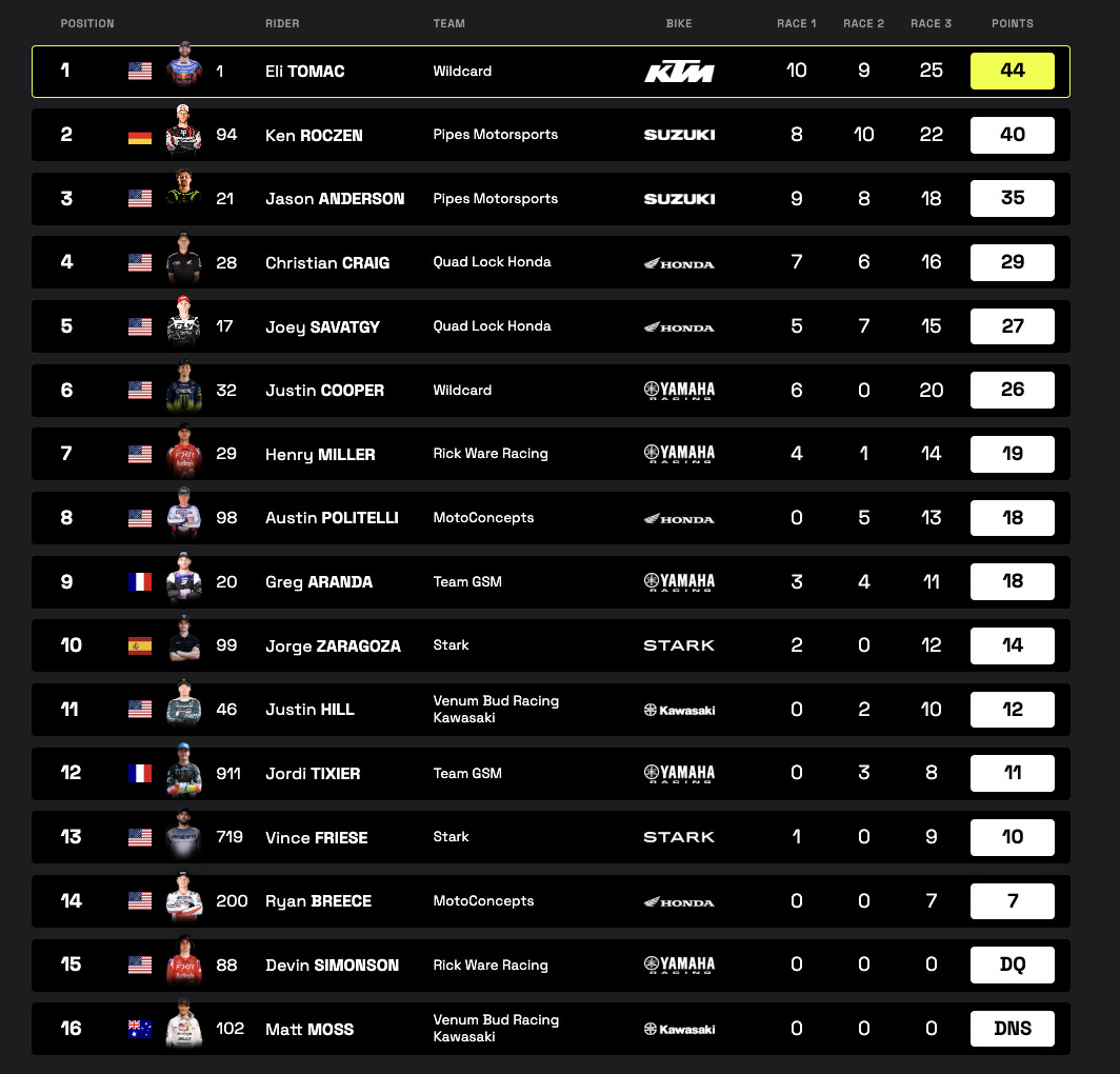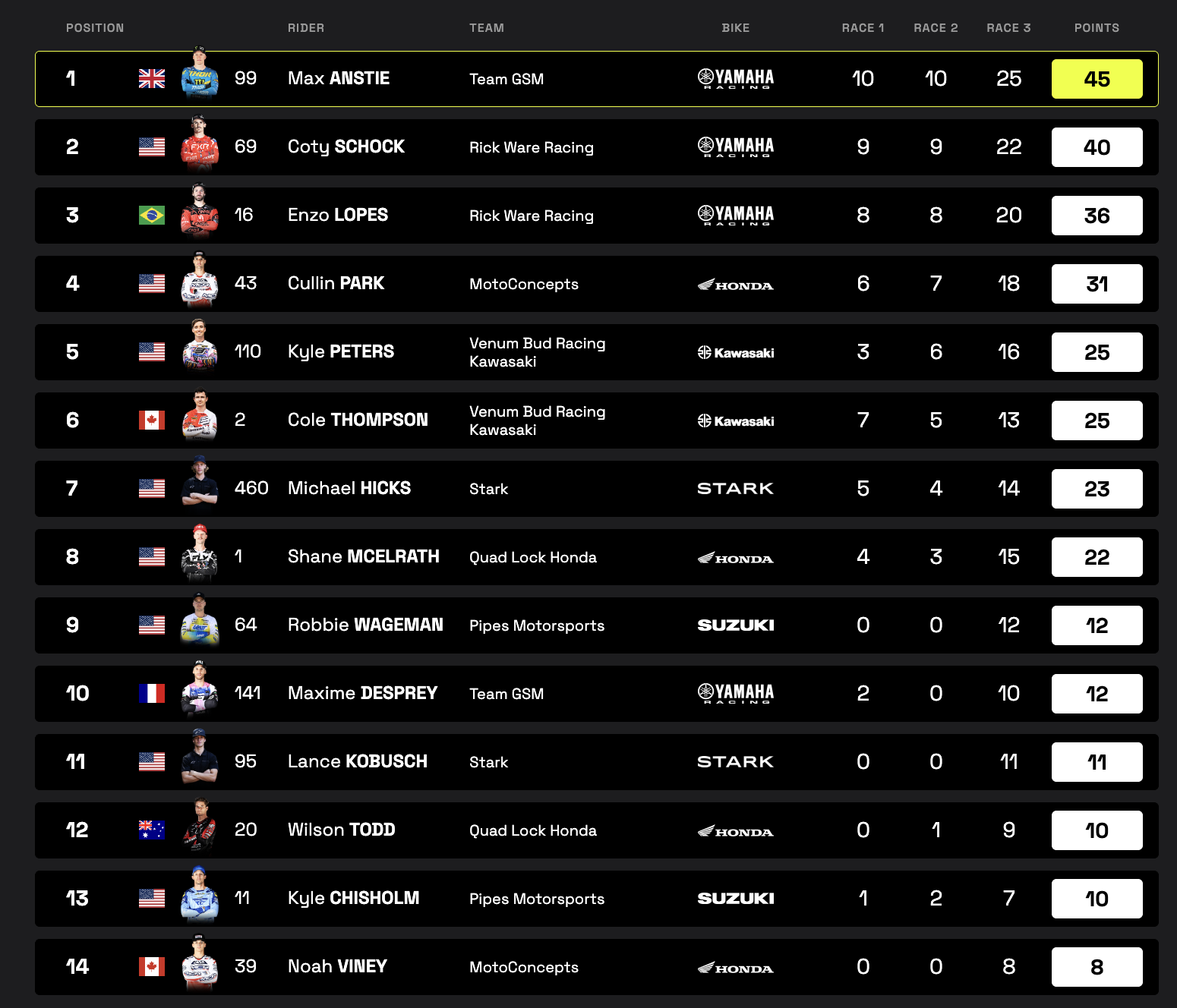 | Haiden Deegan (Yamaha) | Monster Energy AMA Supercross | 250SX West Division |