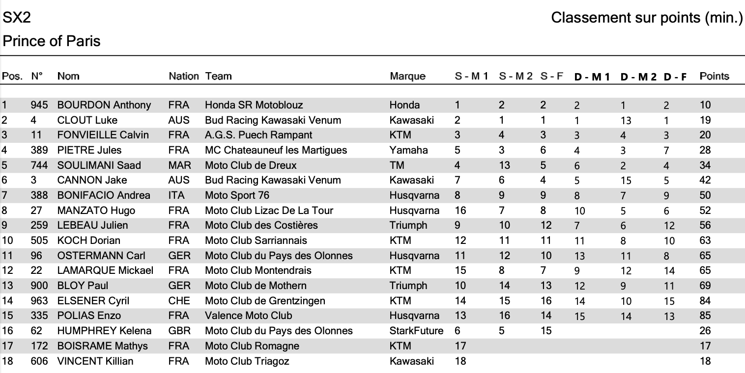 | Anthony Bourdon (Honda) | Paris Supercross | Prince of Paris (SX2) |