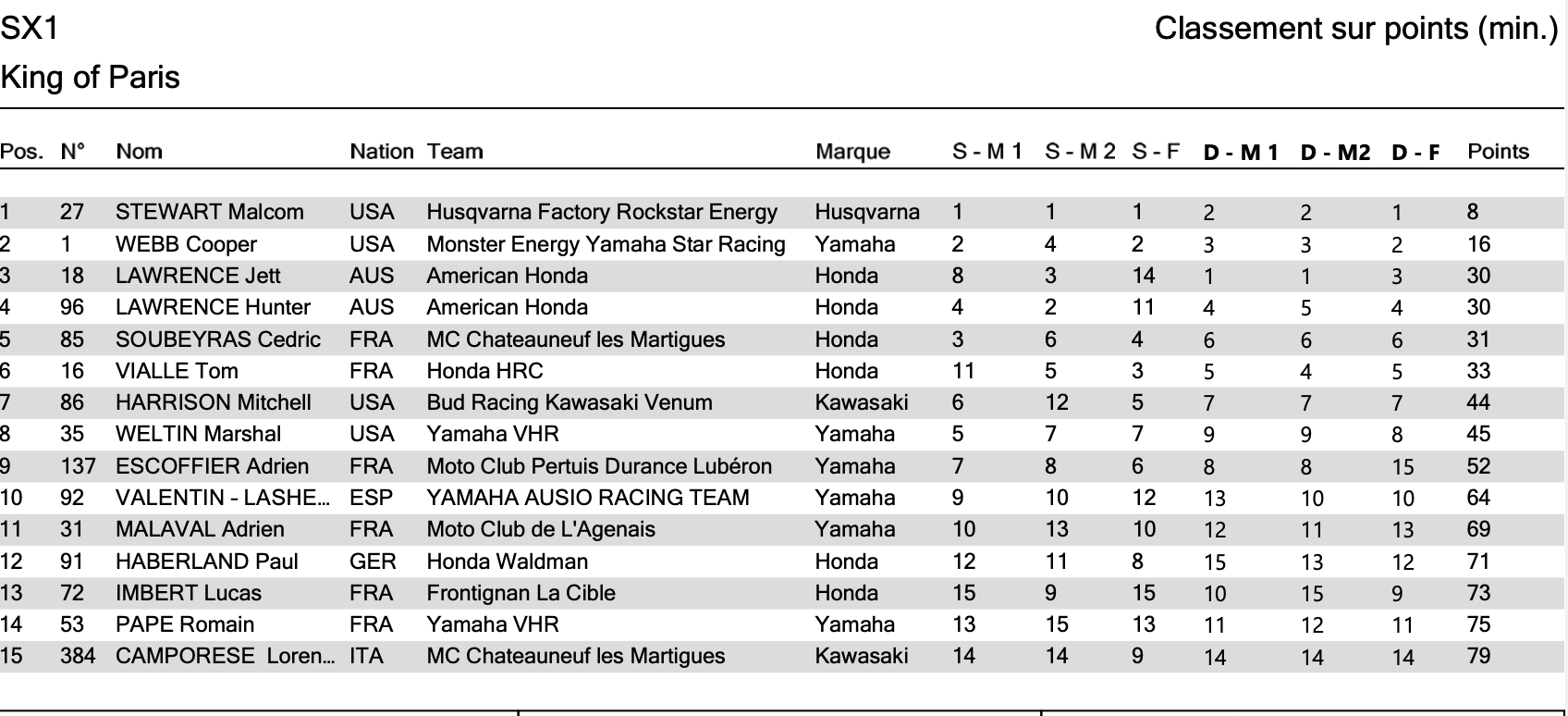 | Malcolm Stewart (Husqvarna) | Paris Supercross | King of Paris (SX1) |