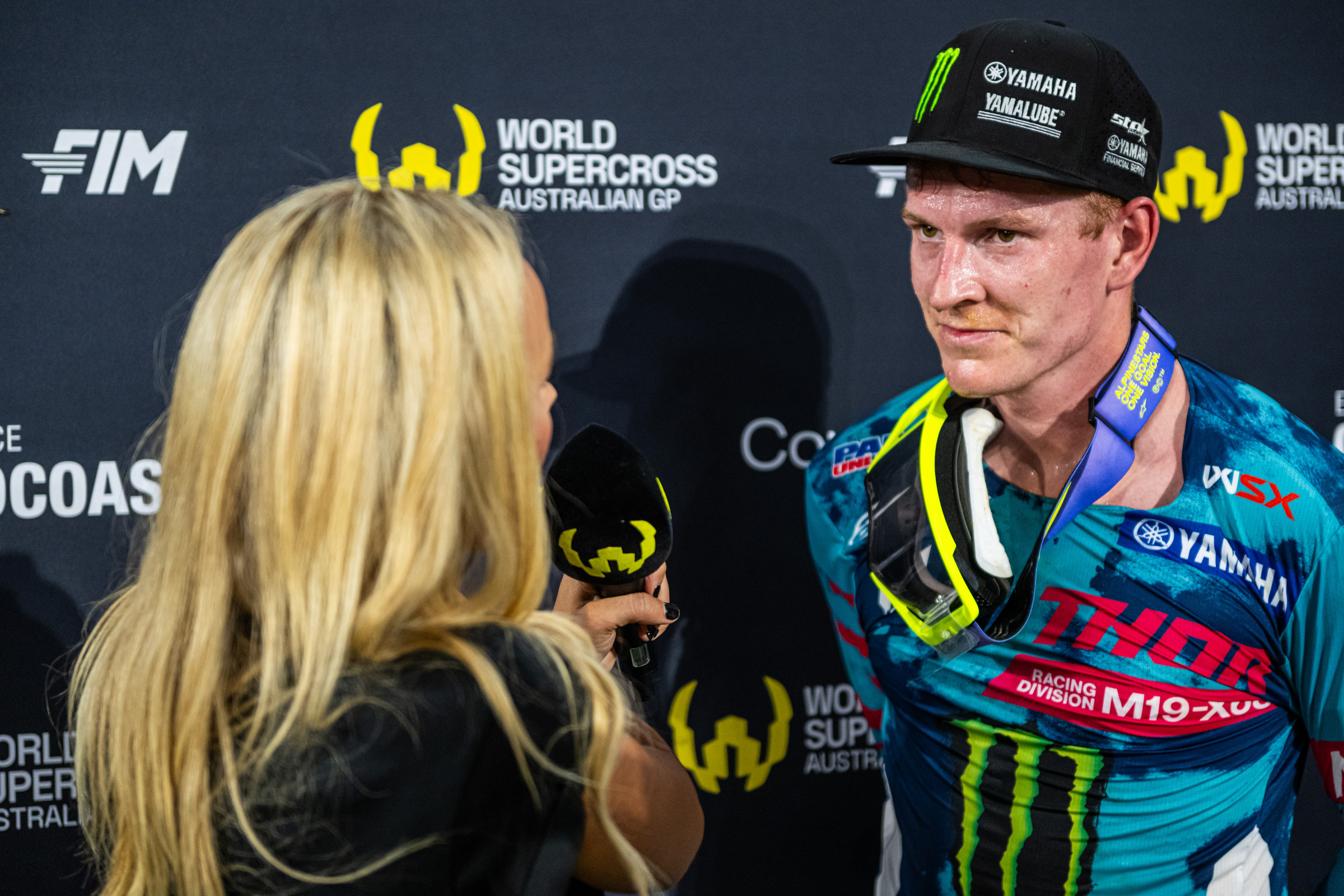 Max Anstie is now three-for-three in the FIM World Supercross Championship (WSX), taking another win this weekend in Australia, though this one was hard-fought against defending champion, Shane McElrath. Steve Matthes caught up with him after the race to hear about his night, travel, the final two rounds of WSX, and his fitness. Max says he is feeling ready to ride in the 250SX West Division come January in Monster Energy AMA Supercross if that’s what his team decides.