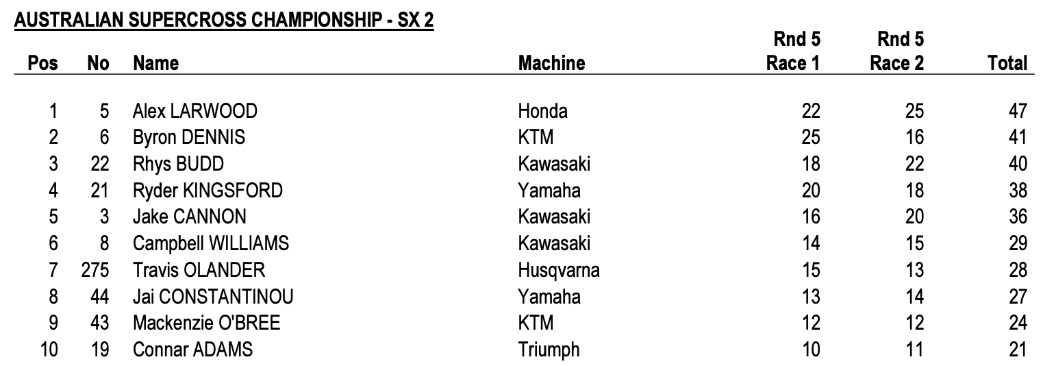 | Ryder Kingsford (Yamaha) | Australian Supercross Championship | SX2 |
