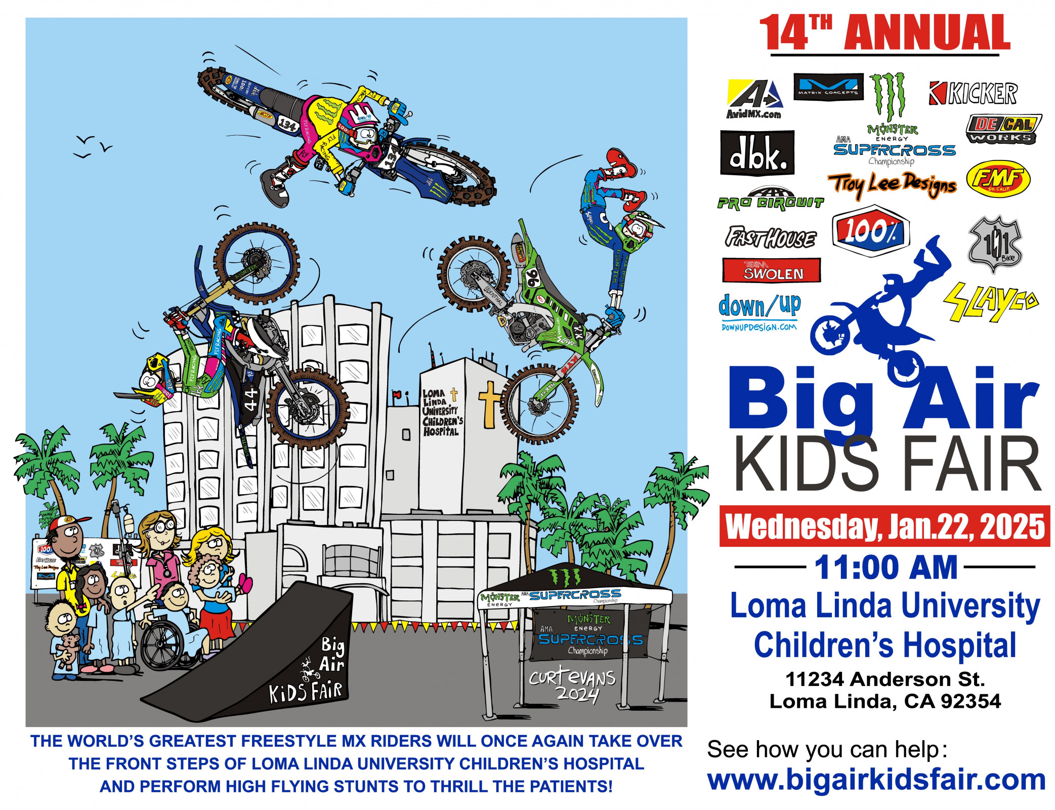 The 14th Annual Big Air Kids Fair will take place at Loma Linda University Children's Hospital on Wednesday, January 22, just ahead of Anaheim 2. Former SoCal hotshoe Steve Bauer organizes the show every year as a way to put a smile on the faces of the young patients and their families. He reached out to his old friend Curt Evans, the cartoon artist from Down/Up Designs, and came up with this cool flyer that features three of the riders who will be putting on the show, Axell Hodges, Twitch and Keith Sayers.