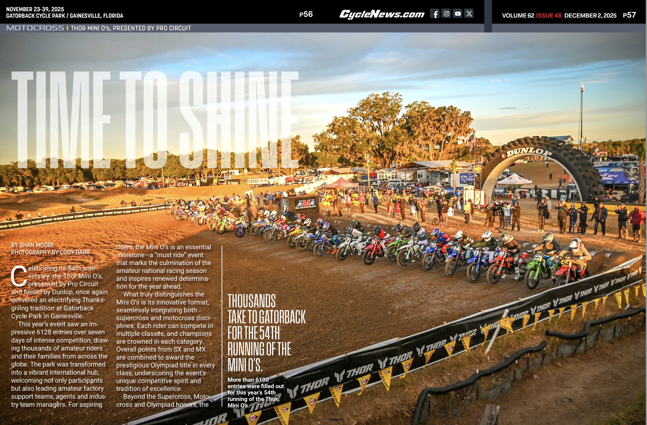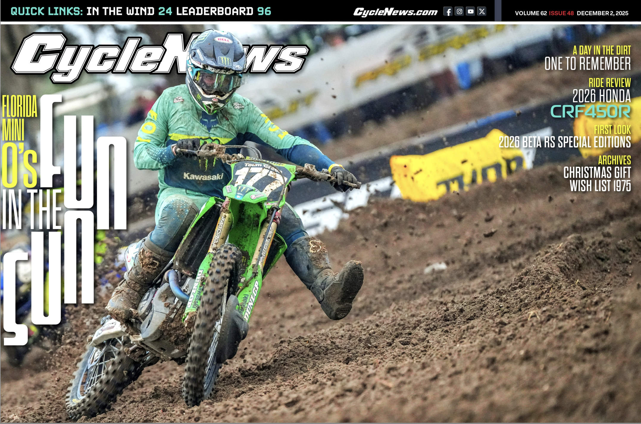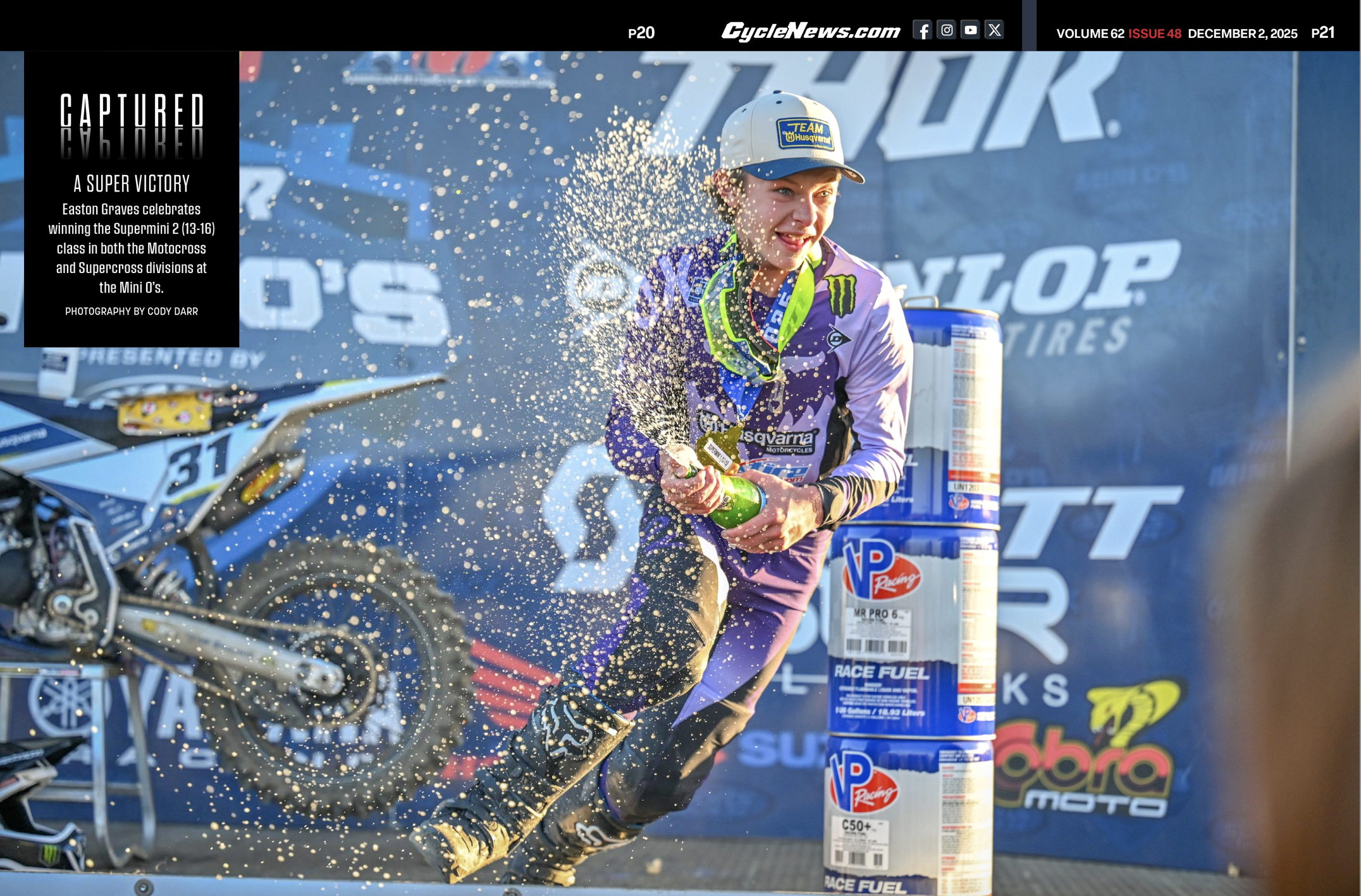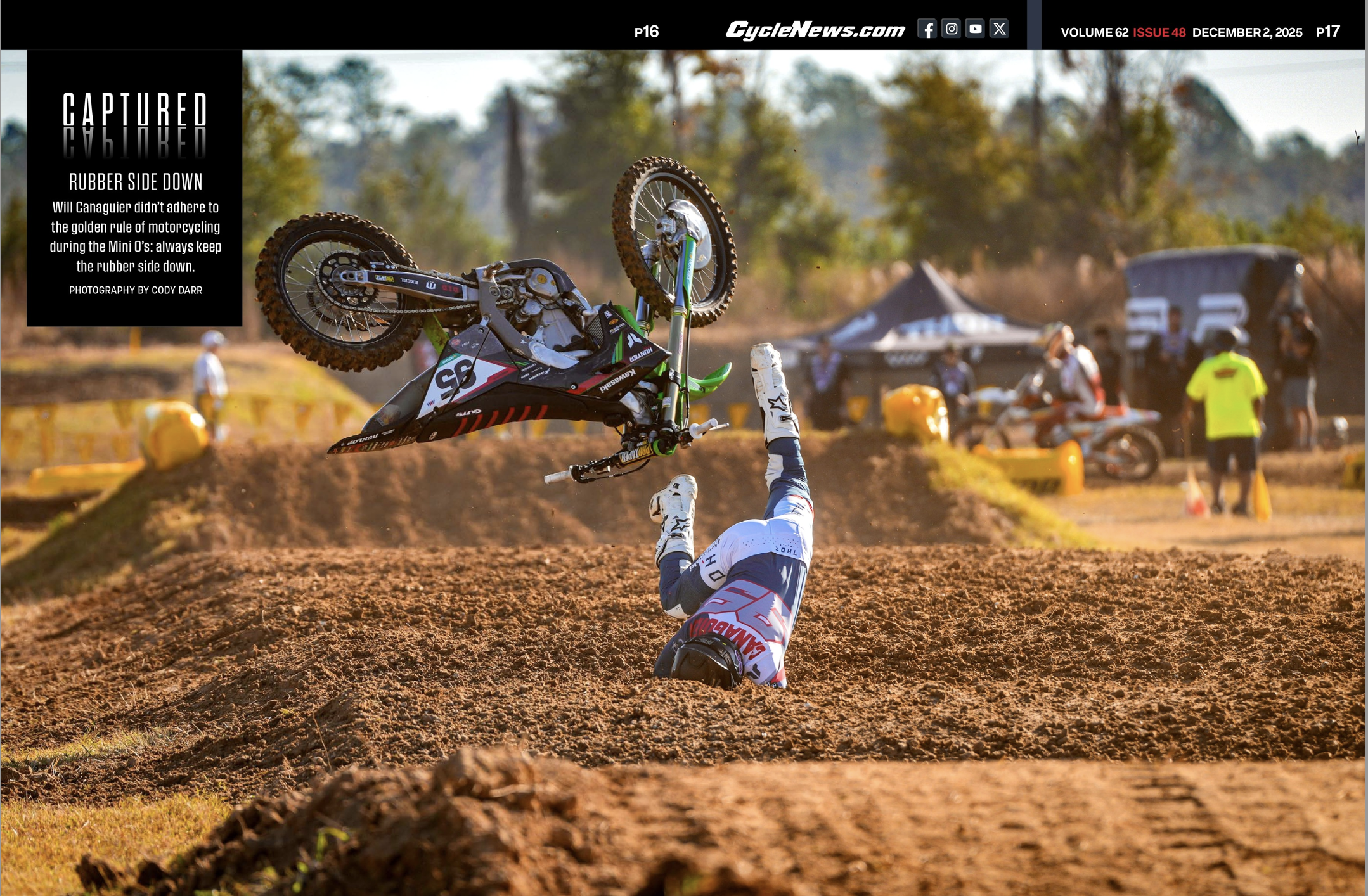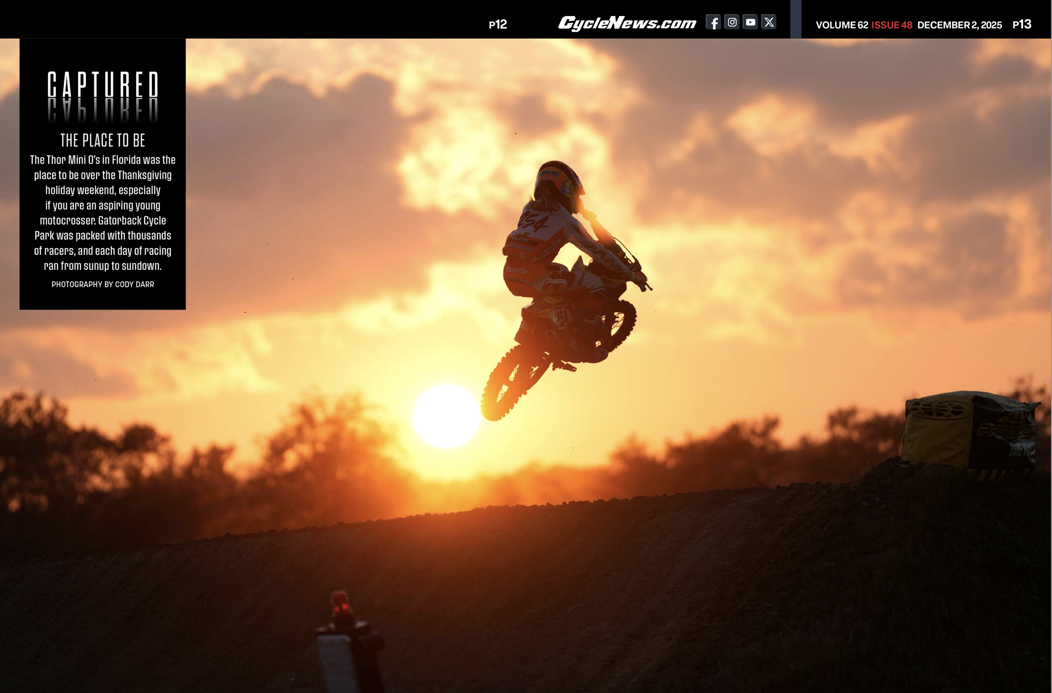 Here at home the two biggest race was the 54th Annual THOR Mini O's. I imagine we will see some ads next week from the likes of Dunlop, Yamaha, Kawasaki, etc. The event did get some excellent coverage thanks for regular contributor Cody Darr, who snapped his first-ever Cycle News cover with a cool shot of standout A and Pro Sport rider Kaden Johnson of Kawasaki Team Green. He also scored a bunch of spreads, including three Captured shots. Nice work, Cody! Look for more of Darr's stuff in the next issues of Racer X Magazine.