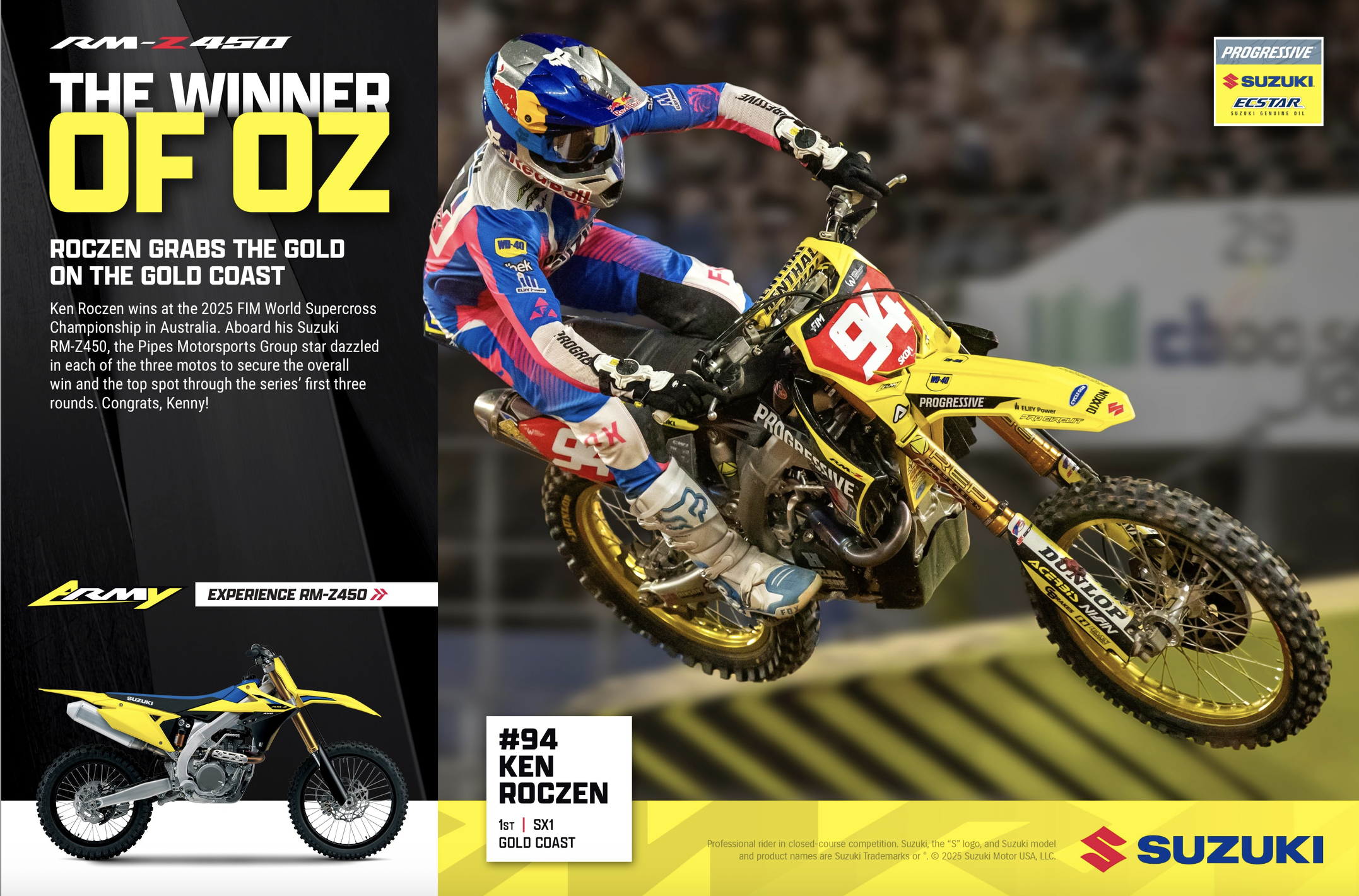 There were slim pickings in the Race Wins Advertising Department at Cycle News this week. Only one made it into this week's issues, courtesy of Suzuki. Their "Winner of Oz" was a crafty take on Ken Roczen's win at the WSX in Australia.