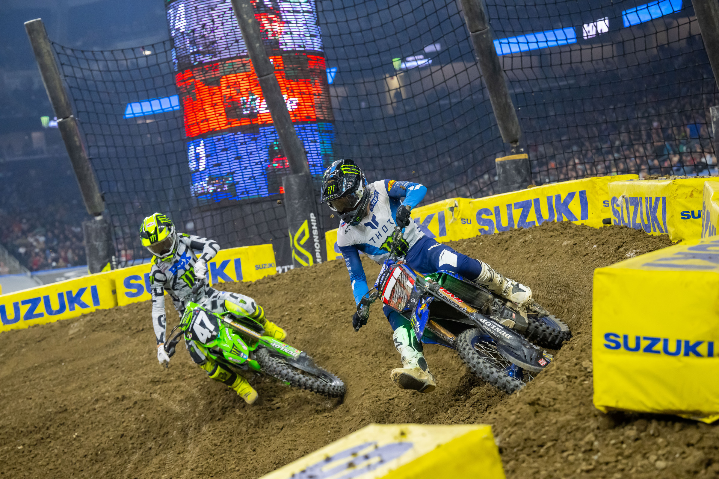 Max Anstie’s seven-second lead over P2 Levi Kitchen was gone due to the natural bunch on the restart and Kitchen was instantly able to capitalize when the green flag waved. He took over the race lead and won on what became a two-lap sprint to the finish. Kitchen later said, “I really don’t feel like I won tonight,” due to the circumstances. Anstie was also frustrated with the way the end of the race unfolded in what was clearly a second straight win for the Yamaha rider.