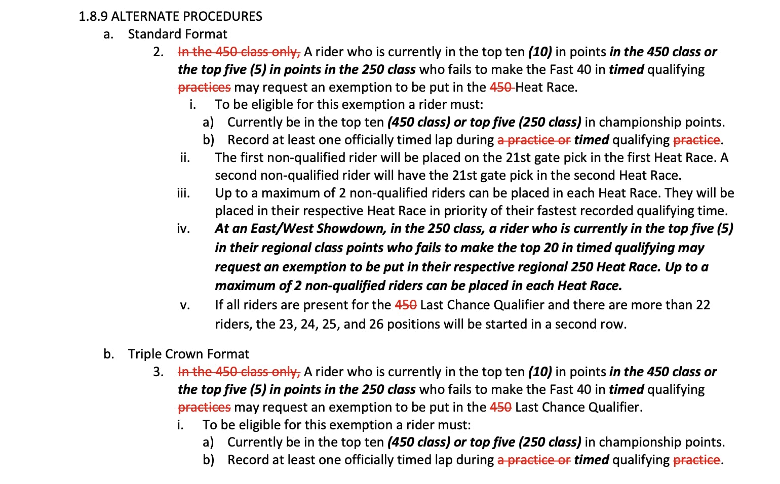 Riders who did not make the fast 40 but are top ten in 450SX OR top five in 250SX may request an exemption to be put in the heat race. Previously, this rule only applied for the 450SX Class, but for 2026, the rule now applies to both 250SX AND 450SX. This applies to Triple Crown events as well, where said rider can request to be put into the LCQ.