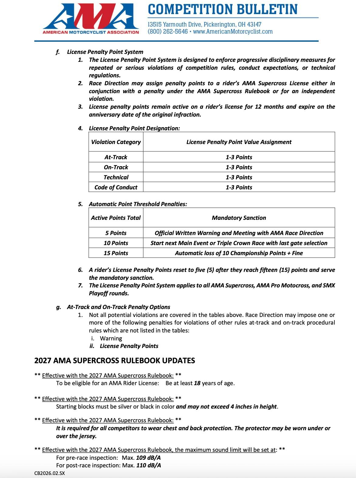 And note, the following comments are posted related to the 2027 AMA Supercross rulebook: