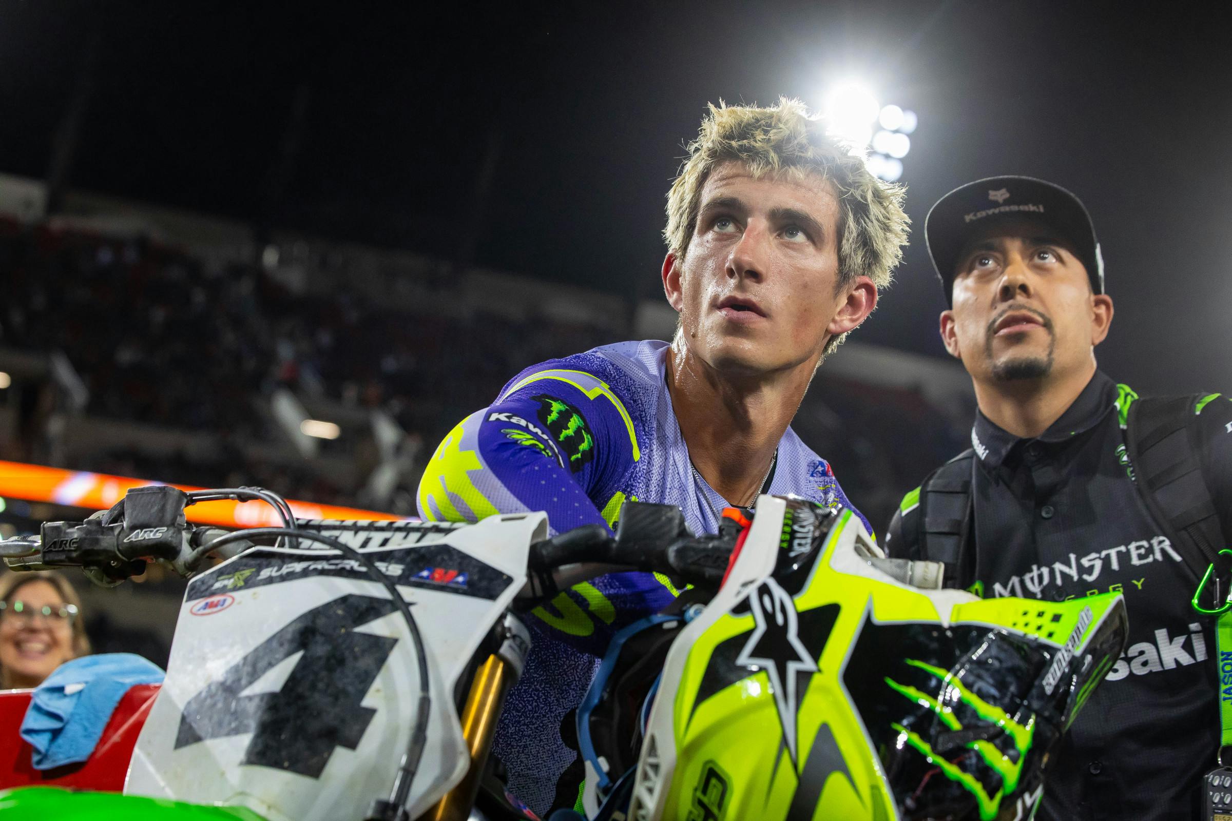 It's been a rough start to the season for Chase Sexton and Monster Energy Kawasaki. After qualifying fastest at Anaheim 1, Chase crashed in the heat race and had his fair share of troubles in the main event as well, to finish eighth on the night. In San Diego, Chase was very uncharacteristically sixth in qualifying but then went on to dominate his heat. Then in the main event, Chase and fans alike felt like they were suffering from deja vu when he got stuck in the gate just like he did last year in Detroit. Chase rebounded quickly and was inside the top ten by the second lap. For a while he was the fastest rider on the track and was able to go from last to fourth, where he finished on the night. Steve Matthes was able to catch up with him after the race.