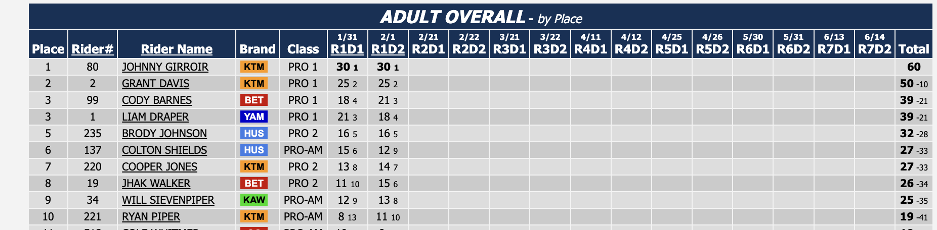 January 31, 2026| Rider | Hometown | Motos | Bike | |