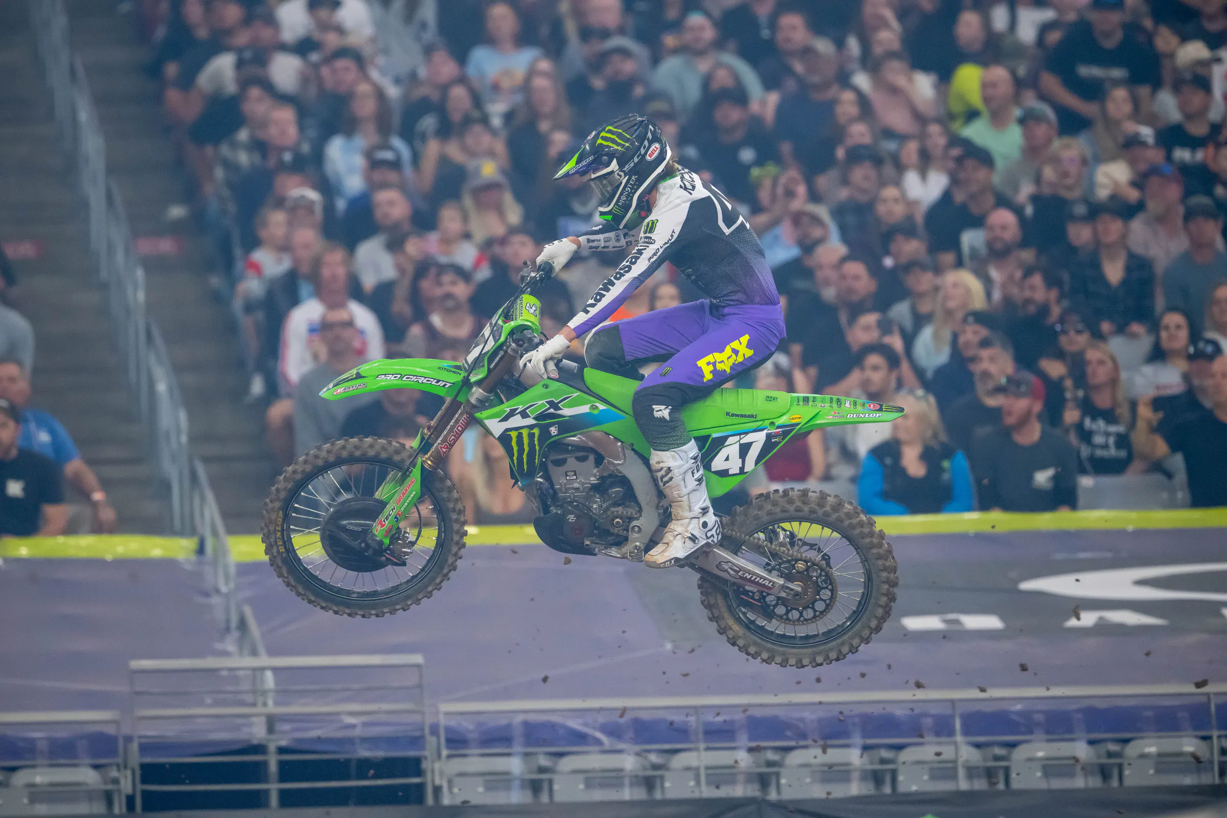 Kitchen’s next stop is Seattle, the home race for the native of Washougal, Washington, and a race he dominated two years ago. He grabbed a huge holeshot that night, by the way. Since then, starts have been an issue. What has changed? Well, Kawasaki introduced a new KX250 engine last year that was very fast on top-end, but the team found it lacked a little bit of the bottom end they wanted for starts. They played with engine packages and gearing during the season last year and made gains, but the off-season really let them go to work. They emerged with so much grunt that it was throwing off Kitchen’s starting technique. What’s the issue? Kitchen is used to sitting way forward on the tank off the line, and when the bike launches hard, he’d get shoved back a bit. Because he’s so tall, every move is exaggerated, so falling backwards even slightly makes a huge change in leverage on the bike.