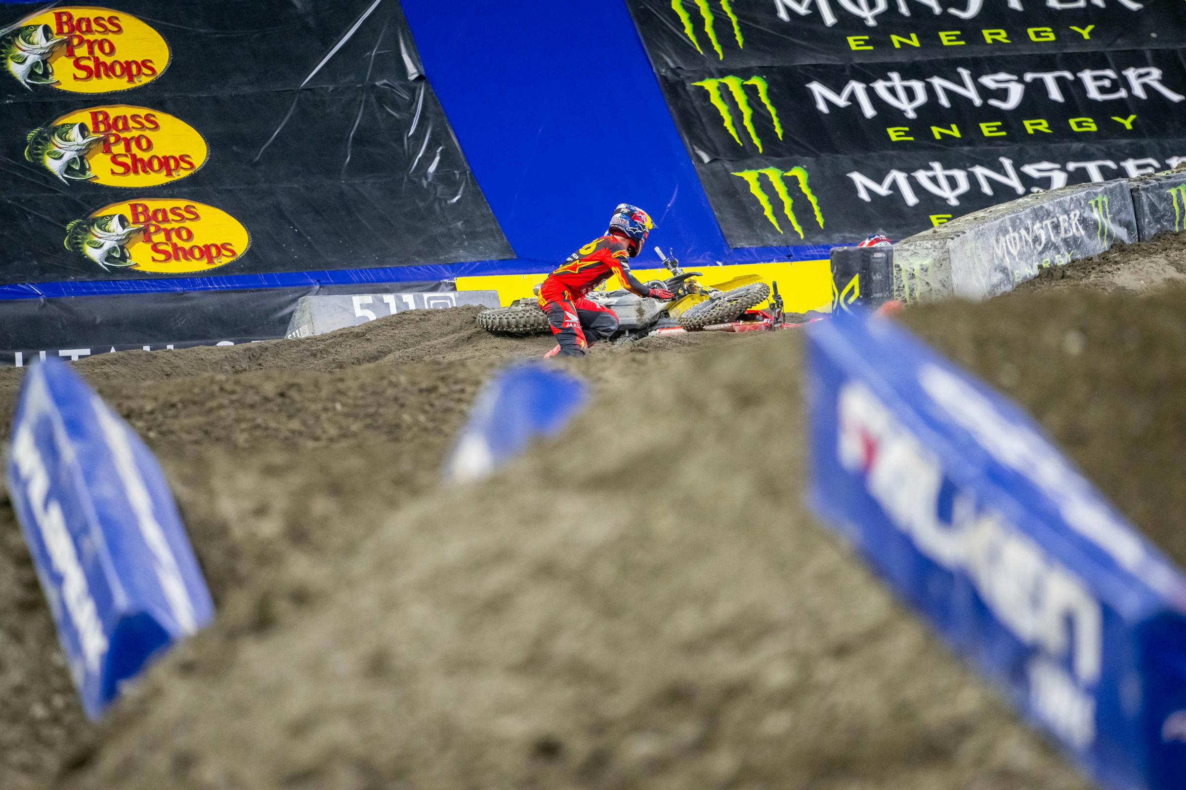Hunter Lawrence fully owned up to his pass attempt on Ken Roczen late in the Seattle Supercross 450SX main event Saturday night. Despite not winning a race yet this season, the always calculated rider came into the sixth round with the points lead. He was going for a pass on Roczen late in the 450SX main event when his line jumping from the inside to outside in the sand turn caused a collision with the #94. The Honda HRC Progressive rider's uncharacteristic pass attempt sent them both to the ground.