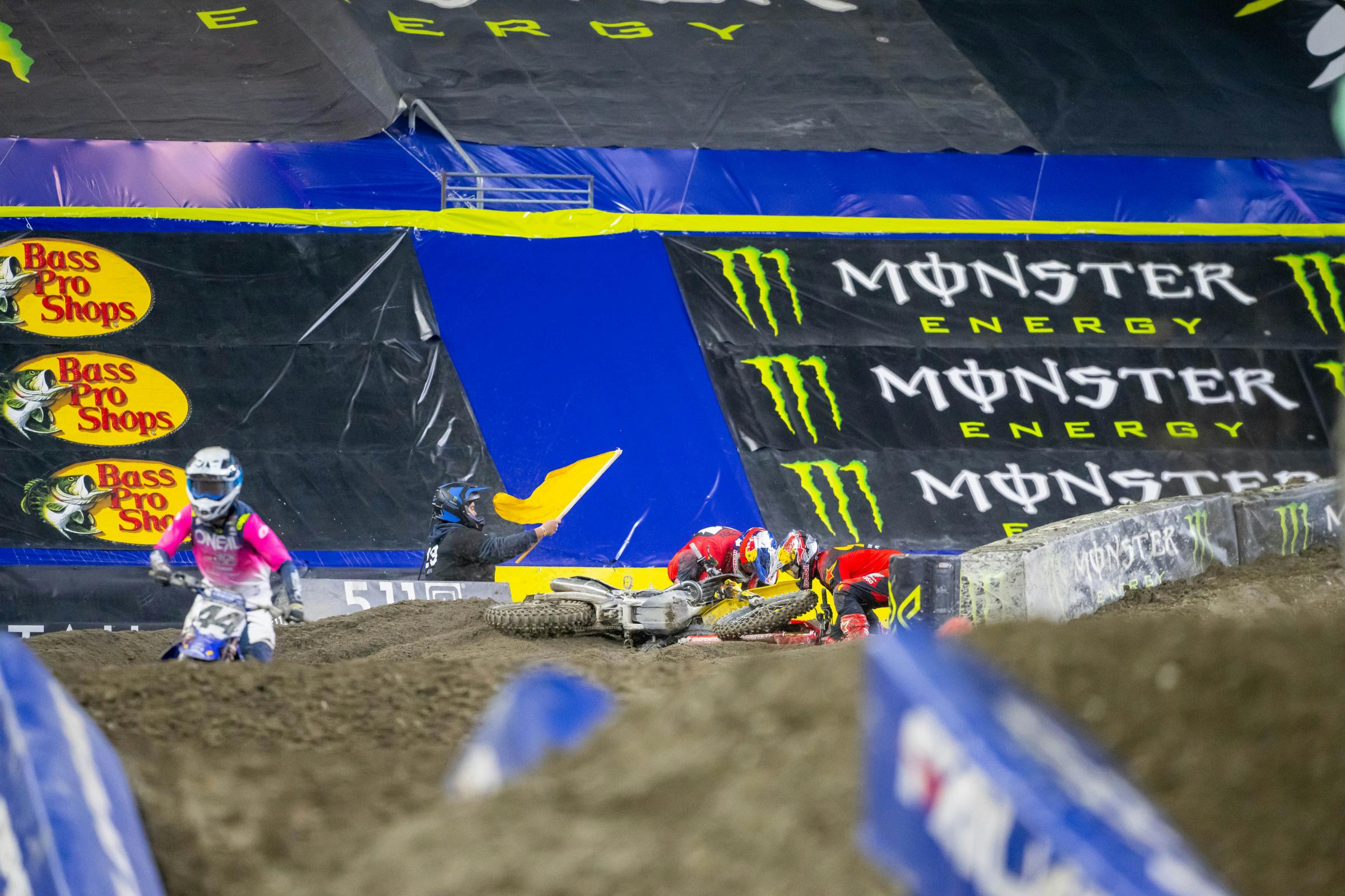 Lawrence said afterwards during a TV interview he felt like an idiot for making the move. Justin Cooper snuck by the two to take the final podium spot but luckily, Lawrence was able to remount and finish fourth place. Roczen took longer to get going (insert your kickstarter jokes here, everyone) and finished tenth, getting lapped at the checkered flag by race winner Eli Tomac.