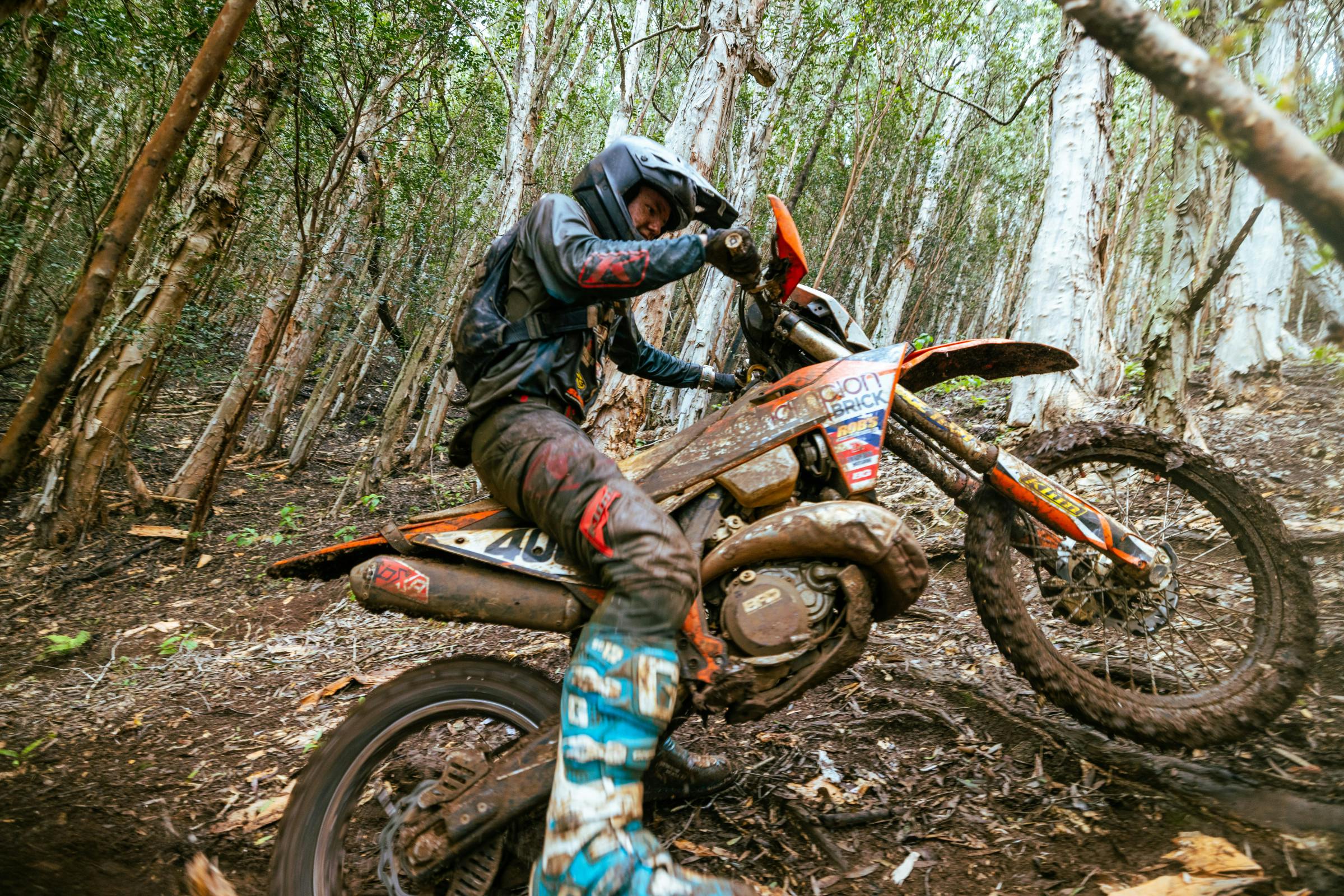 The Ultimate Hawaiian Hard Enduro Main Race consisted of four courses: Pro, A, B, and C. This allowed for racers to be on their respective skill-based course and for traffic to keep flowing safely. The Pro course was approximately 21 miles and took racers through some of the hardest trails in Omao, with a 5-hour time limit to complete it. Omao is a riding area on Kaua’i, where knowledge of the terrain and how to manage the conditions plays into the hands of the locals. The front row took off, with rows behind starting a minute apart. The first third of the course went back to where the Prologue was and is also where the most close battling took place. Huddy took the lead at the first checkpoint, towing the front pack back into the start area for the gas check, before they went into the Omao mountains. The rain really started to come down at this point. Huddy and Kamakana were within seconds of each other for nearly half the race, but Kana’s bike started to lose a clutch and had to return to the pits about ¾ through the race, losing his proximity to the front spot. Huddy checked out after Kana had to pull off, riding a smooth race and taking advantage of first tracks in the mud.
