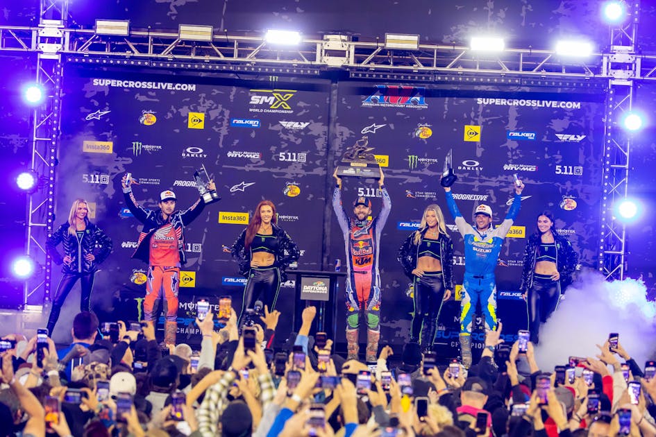 Hear from the podium finishers at the 2026 Daytona round of Monster Energy AMA Supercross, with Eli Tomac, Hunter Lawrence and Ken Roczen in the 450SX class, and Seth Hammaker, Cole Davies and Pierce Brown in the 250SX class. Plus SMX Next winner Deacon Denno.
