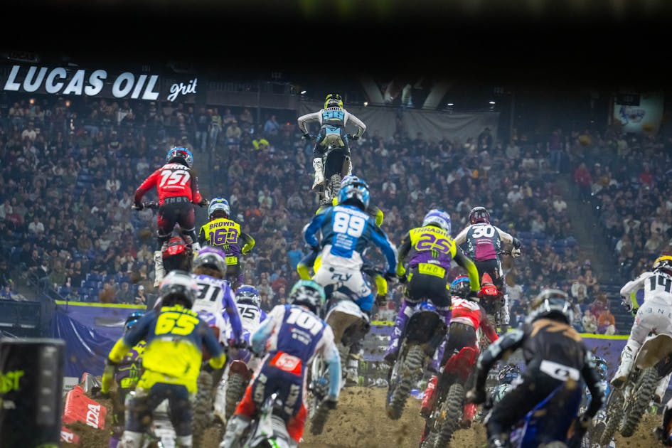 Does the series really have a chronic problem with lapped riders, or was what happened in Indianapolis something of an outlier? Personally, I'm going to go with the latter. As mentioned above, the Indy round was a Triple Crown race, which meant three mains, each 12 minutes plus one lap in length for the 450s. However, the track was one of the more compact ones we've seen this year, with the fastest qualifier (Tomac) dropping a 45.434 lap time. A lap that long was asking for trouble because even though these were the 22 best—and currently healthy—450SX riders on the planet, there would be lapping on such a short track. The last man to qualify directly to the main was Twisted Tea Suzuki Presented by Progressive Insurance’s Colt Nichols, who qualified 18th with a 47.525 lap. That's 104.6 percent of the fastest time in qualifying.