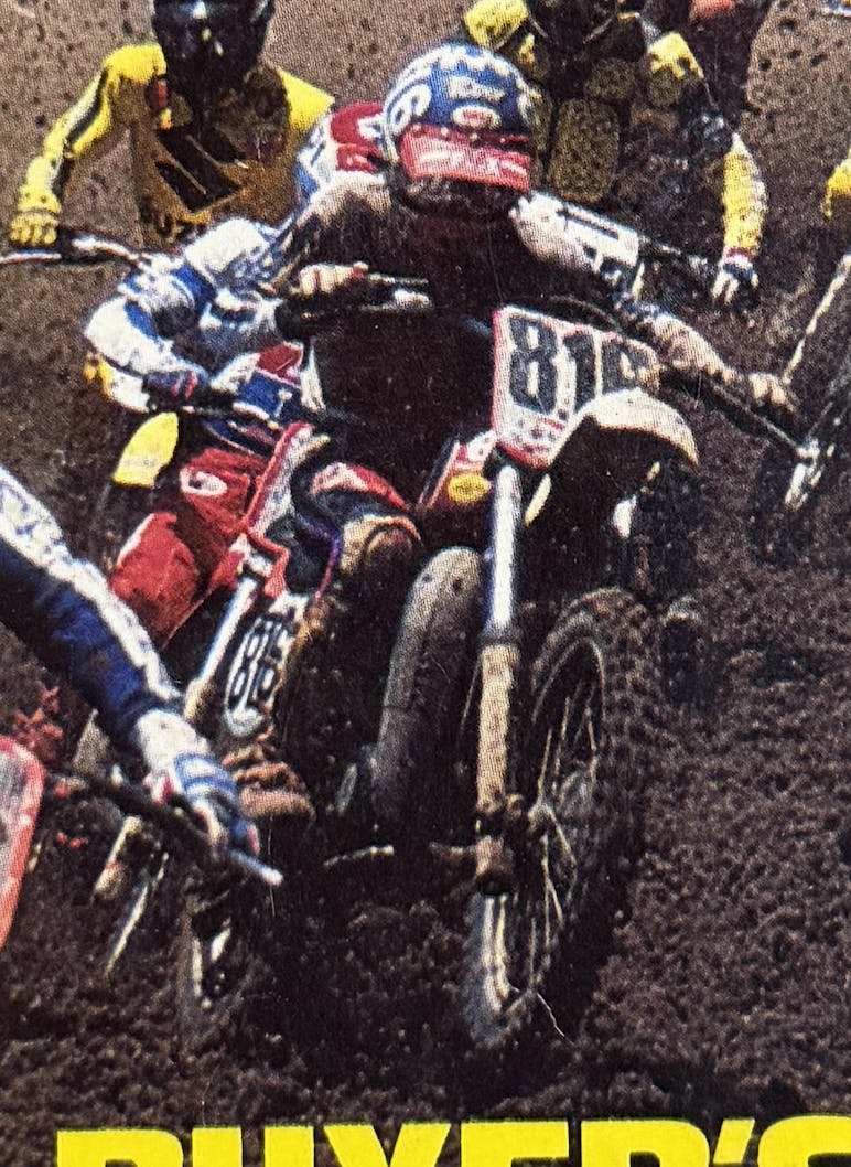 The 1981 Pro Motocross Annual was a yearbook put out by a company called Argus Publications. The editor was the late Brad Zimmerman, a lifelong moto enthusiast and journalist. The cover photo seemed odd at first, and then we realized it was the 250 Support class from the 1981 U.S. 500cc Grand Prix of Motocross at Carlsbad Raceway: #12 on the Kawasaki is Jeff Ward; #7 on the Honda is Jim Gibson. And at first, I thought #717 on the right was my big brother Tim, who wore that number as a Pro-Am, but in '81 he was still racing amateur. Turns out it's a privateer named Tim Lunde.