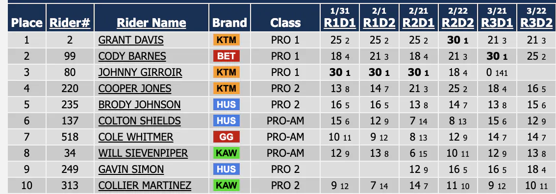 | 6 | Cooper Webb | 52.572 | Newport, NC | Yamaha YZ250F | ||