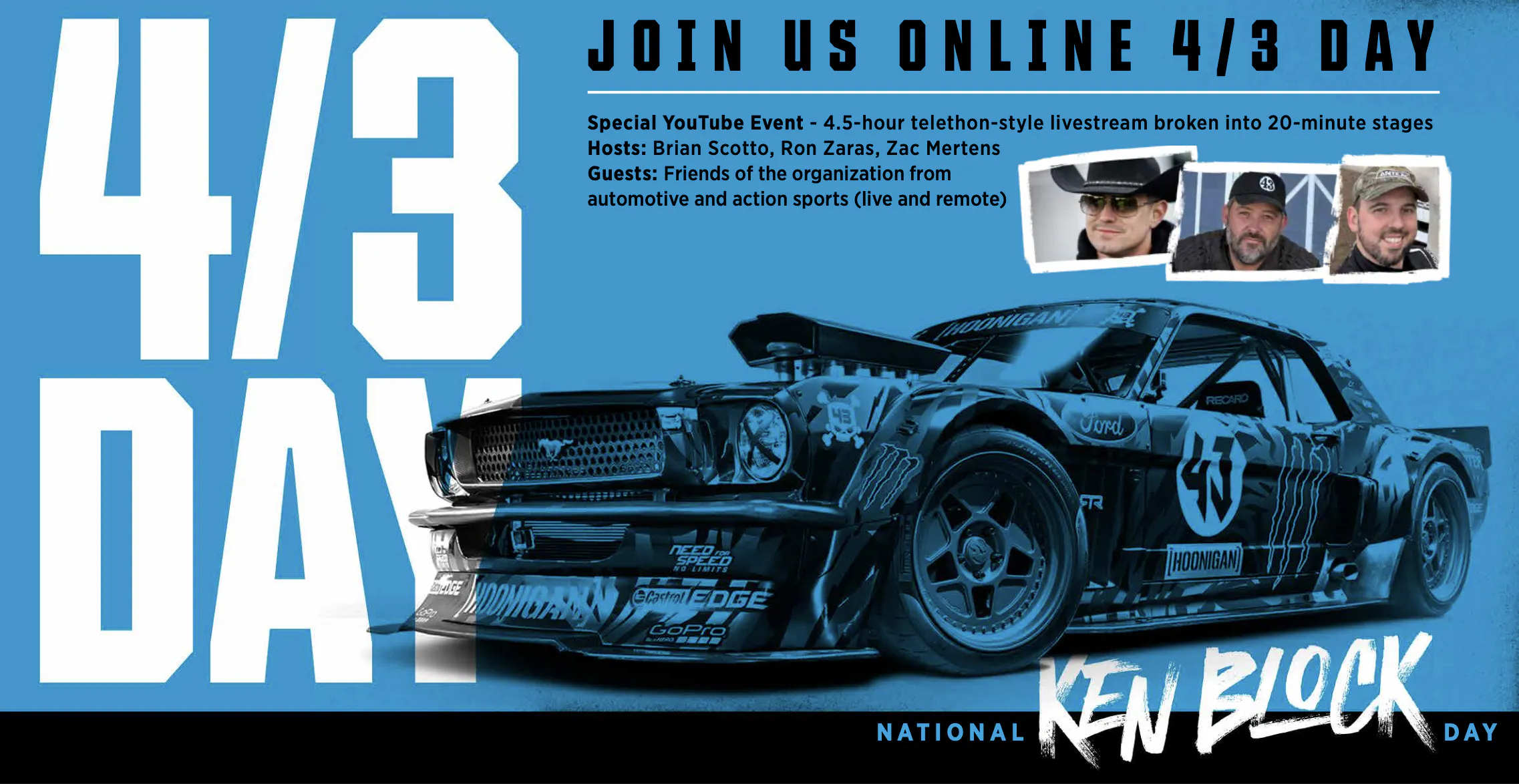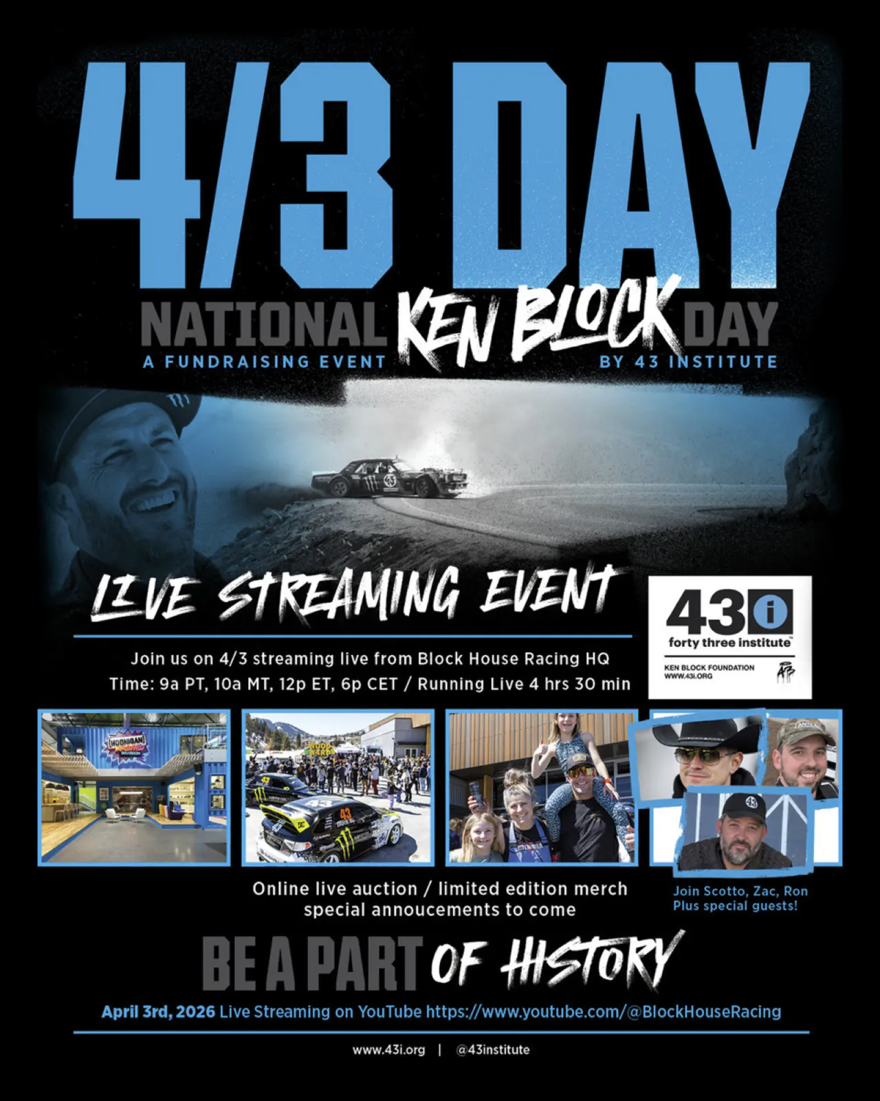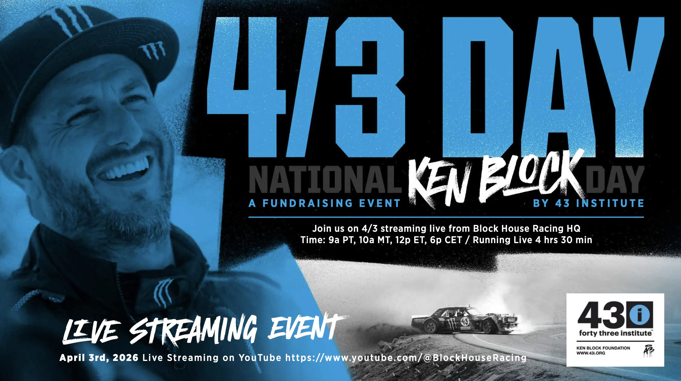 4/3 Day 2026 is a 4.5-hour livestream fundraiser on April 3 supporting 43 Institute (the Ken Block Foundation). Streaming live from Block House Racing HQ, hosted by Brian Scotto, Ron Zaras, and Zac Mertens with friends of the organization dropping in throughout the day.