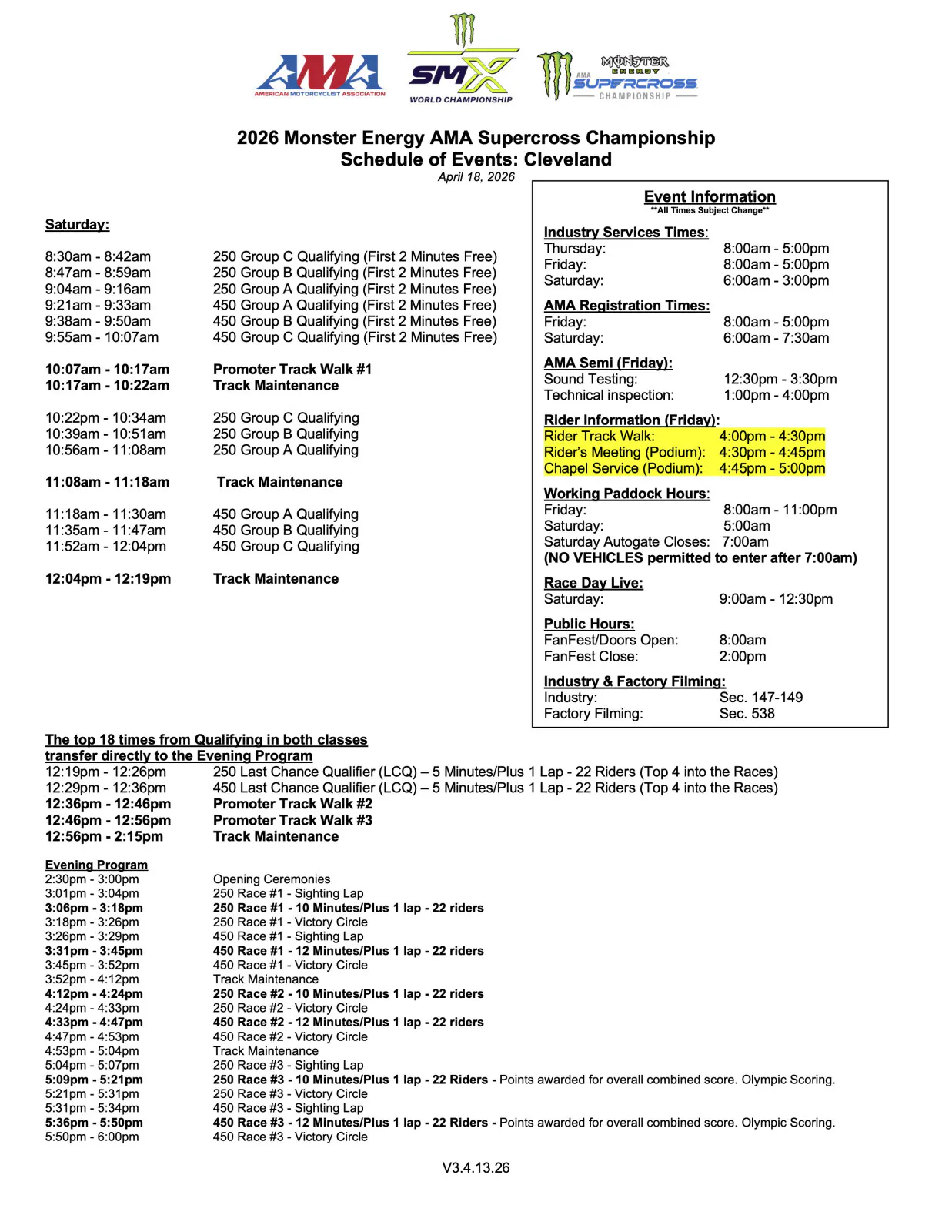 This weekend’s Cleveland SX, the 14th round of Monster Energy AMA Supercross Championship, will take place on Saturday at Huntington Bank Field.