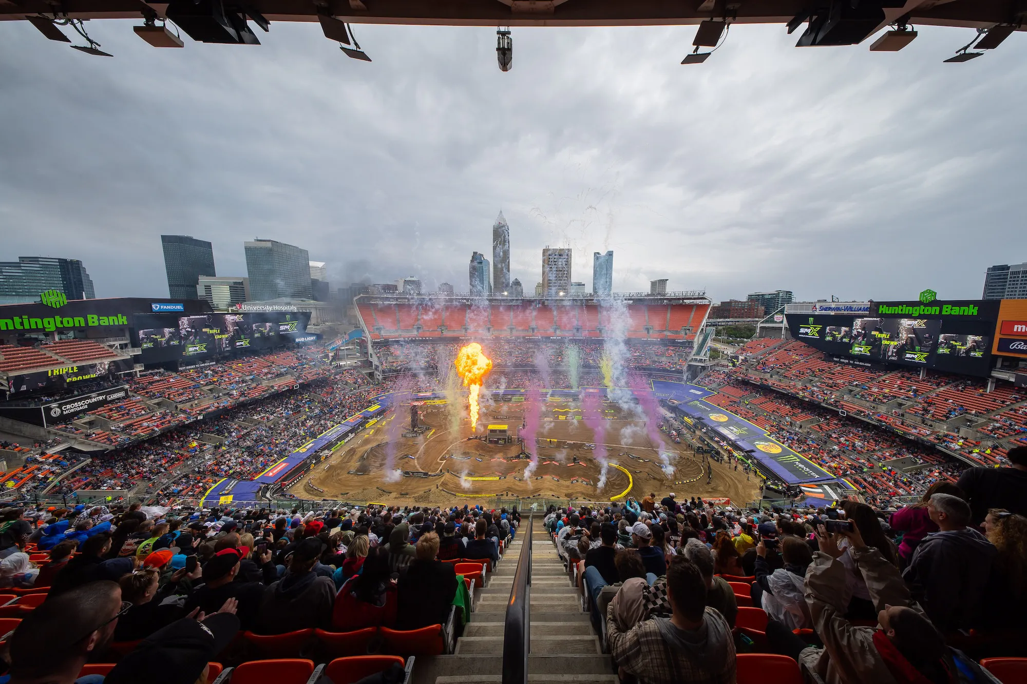 CLEVELAND – For the first time in three decades the Monster Energy AMA Supercross Championship visited the shores of Lake Erie, where an enthusiastic crowd inside Huntington Bank Field braved rain showers, cold temperatures, and swirling winds for Round 14 of the 2026 Monster Energy SMX World Championship. The conditions were certainly a factor as the 450SMX Class title fight took yet another dramatic turn in what has become a historic season for the sport’s premier crown. A wild afternoon of racing saw Progressive Insurance Cycle Gear Suzuki’s Ken Roczen prevail with his fourth win of the year following an unbeatable level of consistency across all three races that brought him within a single point of the championship lead after an adversity plagued effort for Honda HRC Progressive’s Hunter Lawrence.