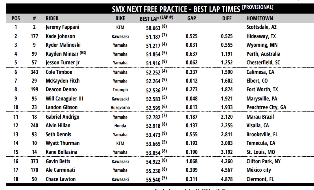 The SMX Next free practice and the field was led by Jeremy Fappani, Kade Johnson, and Ryder Malinoski. Kayden Minear and Jesson Turner rounded out the top five as this session will not count for overall qualifying.