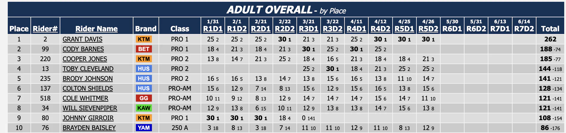 | 6 | Chase Sexton | La Moille, IL | 195 |