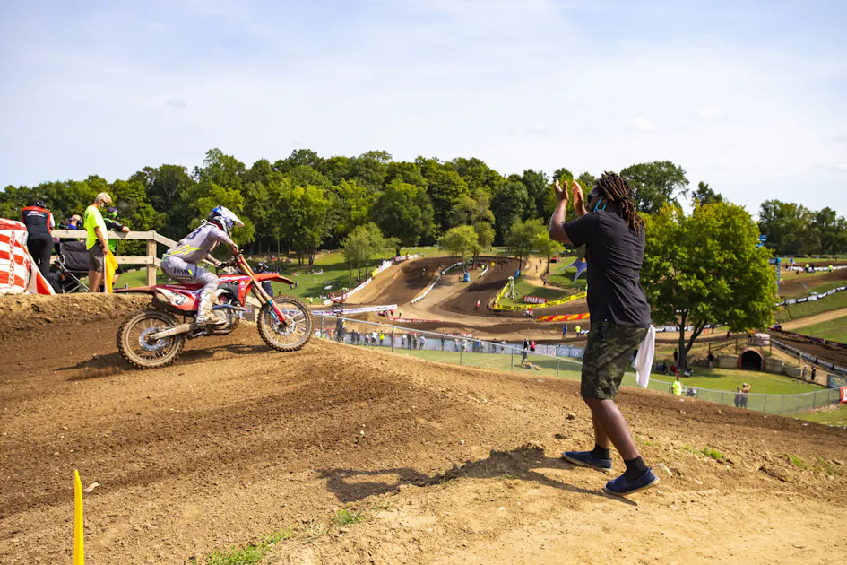 Team Honda HRC’s Chase Sexton gets the go-ahead from his riding coach, James Stewart, at the RedBud 2 National. Sexton has been riding under the tutelage of Stewart, a multi-time SX/MX champion, since the coronavirus shutdown back in the spring, using the Stewart Compound as their classroom. (It’s also sometimes shared by Sexton’s fellow 450 rookie Adam Cianciarulo.) Stewart’s surprise appearance at RedBud in Michigan—a track where he won several times during his own career—was thought to be his first at an outdoor national since his last race, the 2016 Washougal National.